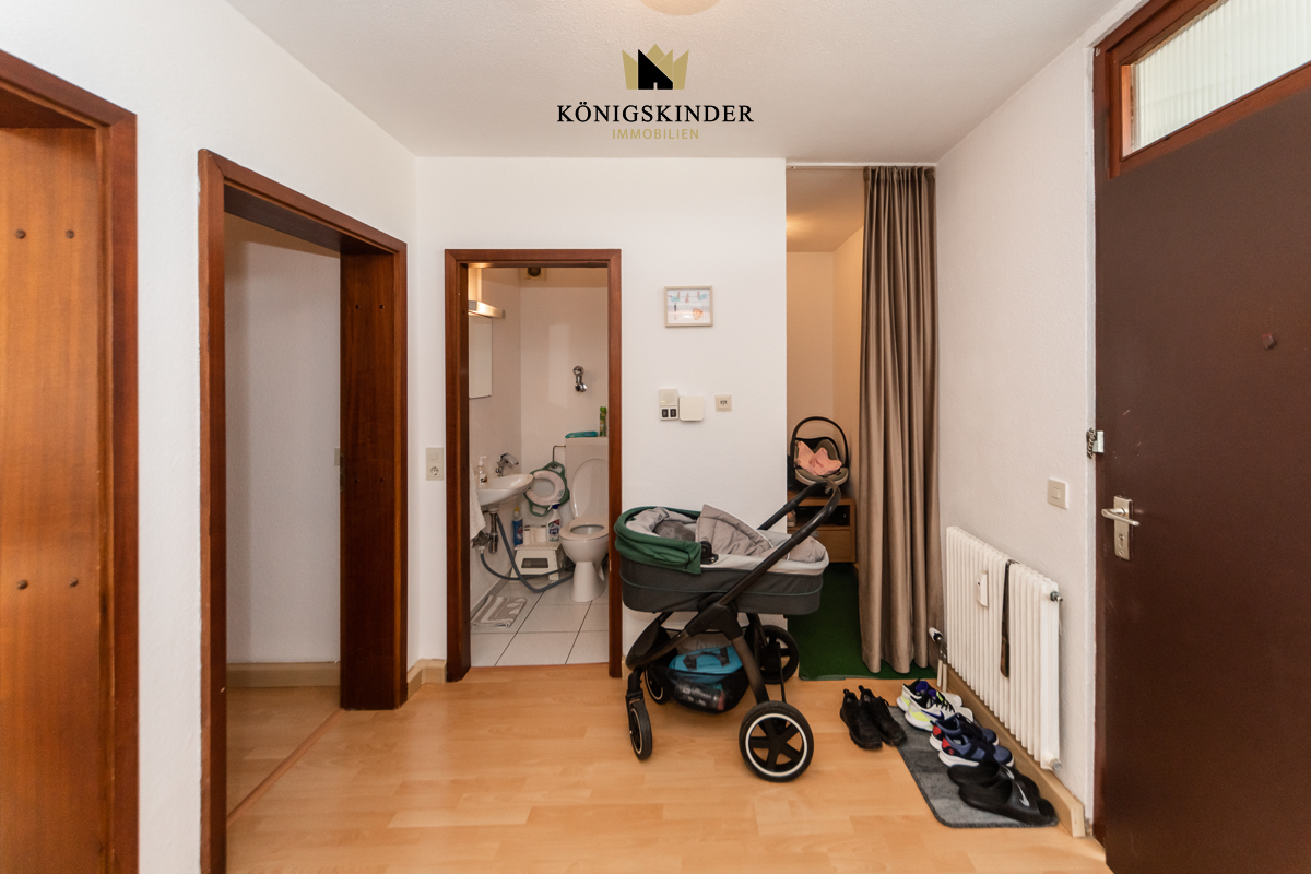 Ein zentral gelegener Eingangsbereich empfängt Sie und führt in die gut geschnittene Wohnung. Der helle Wohnbereich überzeugt durch seine Großzügigkeit und bietet Zugang zum Balkon, der zusätzlichen Raum für Entspannung im Freien schafft.