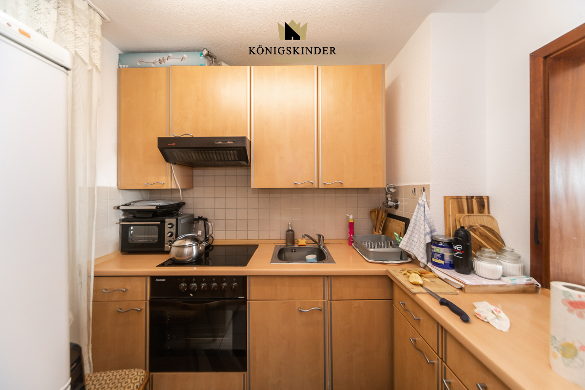 Das Schlafzimmer ist ruhig gelegen und bietet ausreichend Platz für individuelle Gestaltung. Die separate Küche ist funktional und lässt sich nach eigenen Vorstellungen modernisieren.