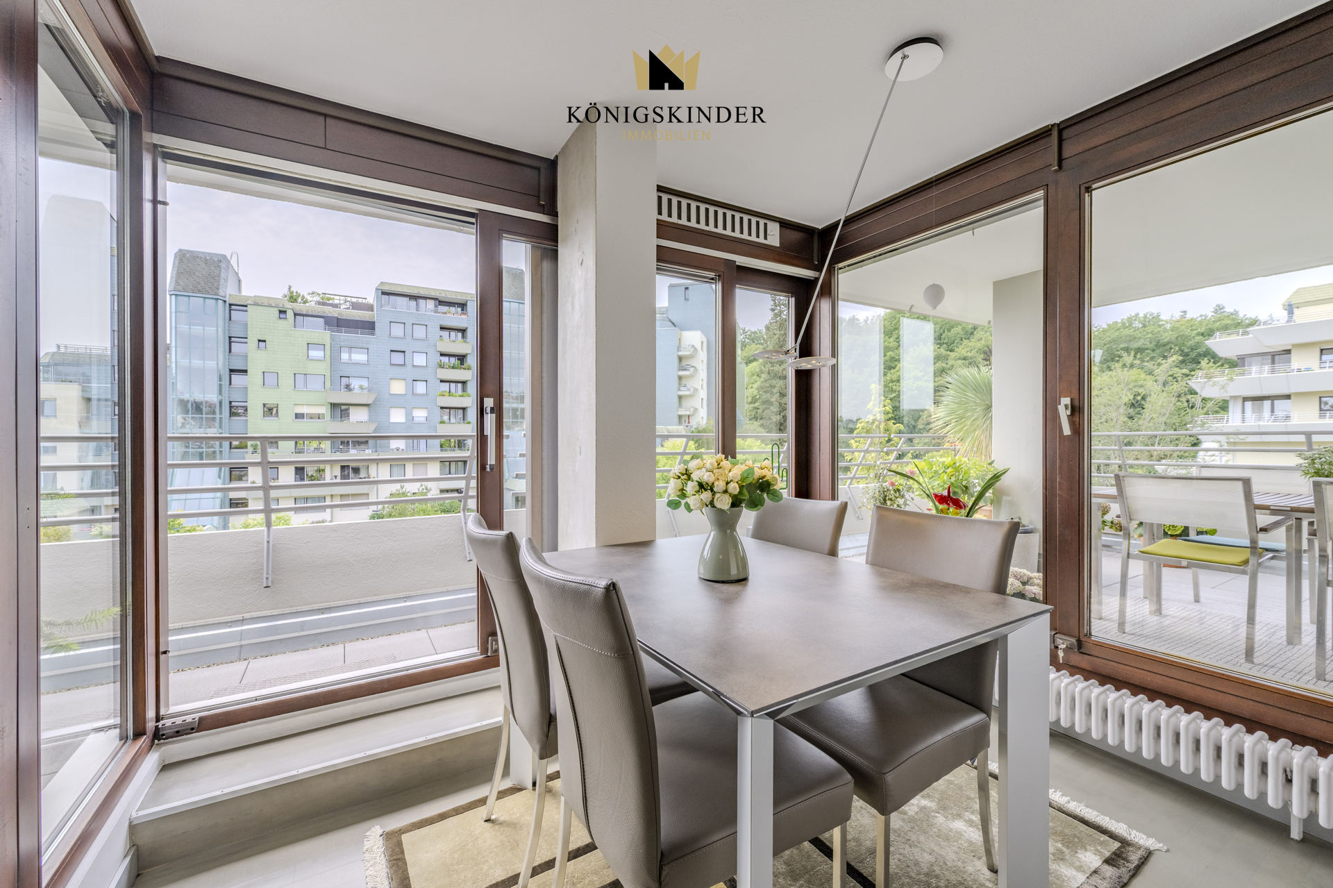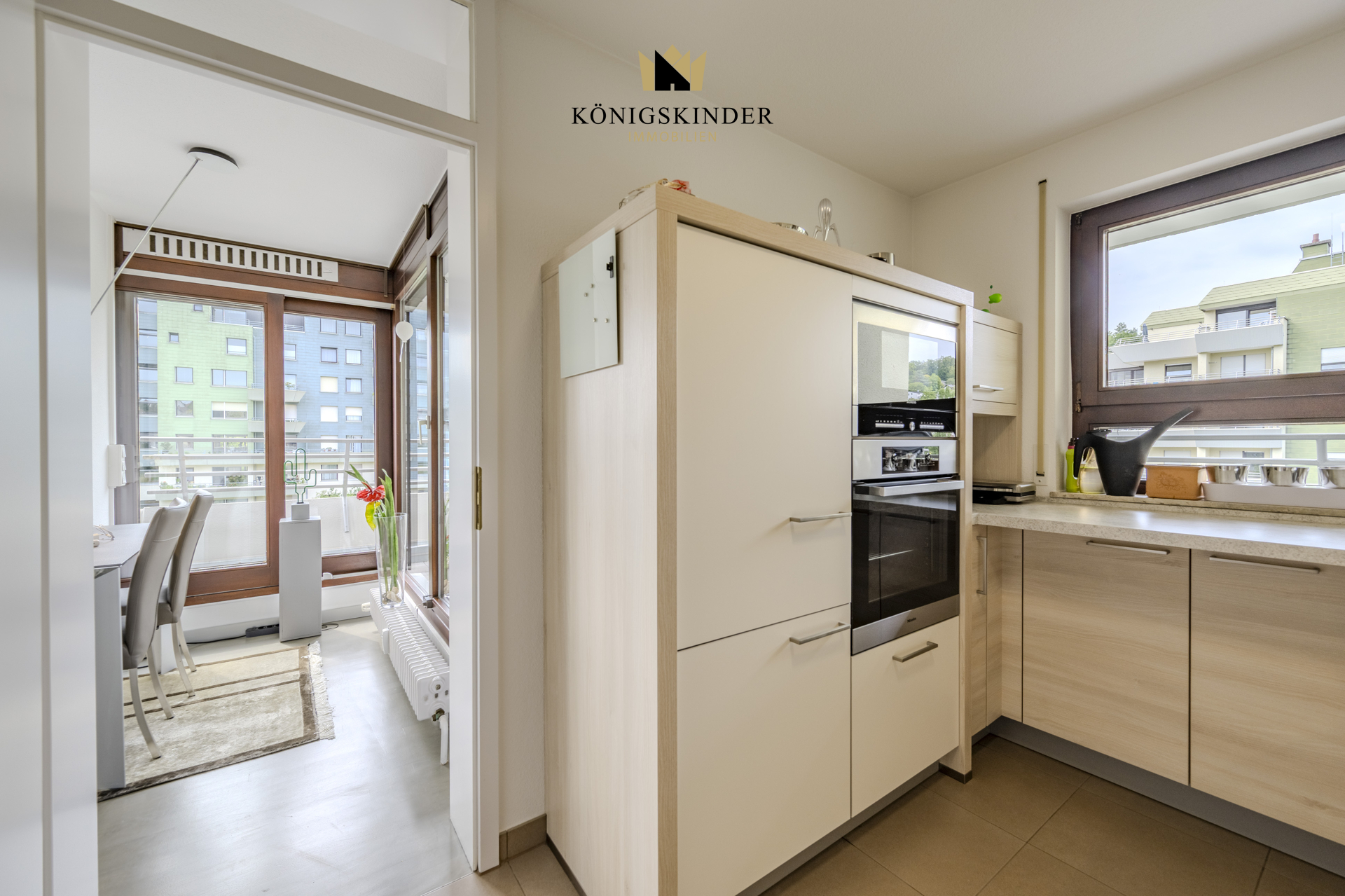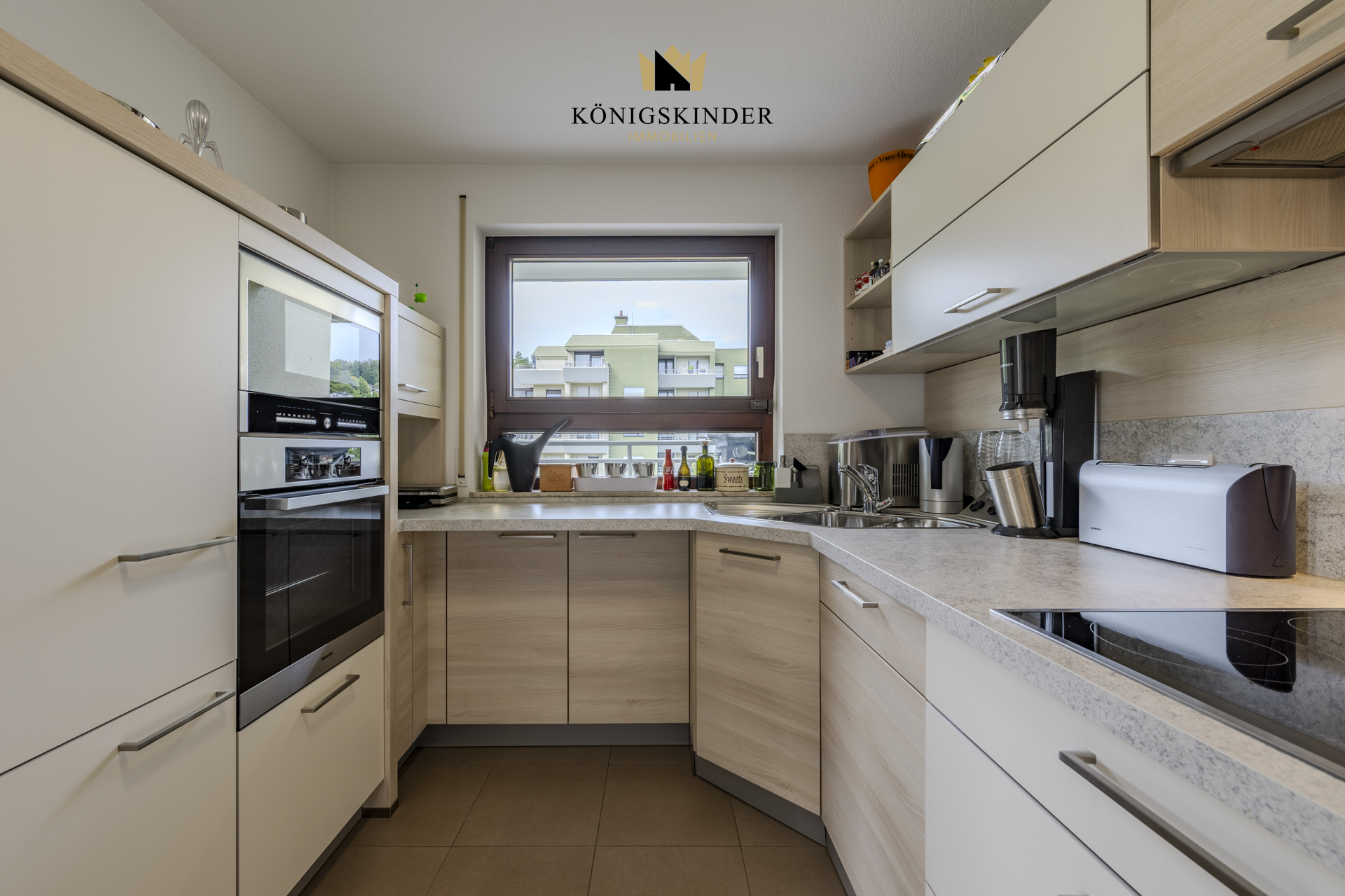 Die Terrasse ist so ausgerichtet, dass man eine Panoramaausicht ins Grüne und in den umliegenden Stadtteil hat. Der Essbereich ist 2-seitig verglast und bietet die selbe Aussicht. Die Einbauküche ist eine sehr hochwertige Markenküche mit adäquater Ausstattung und entsprechenden Elektrogeräten. Sie ist Bestandteil des Kaufpreises.