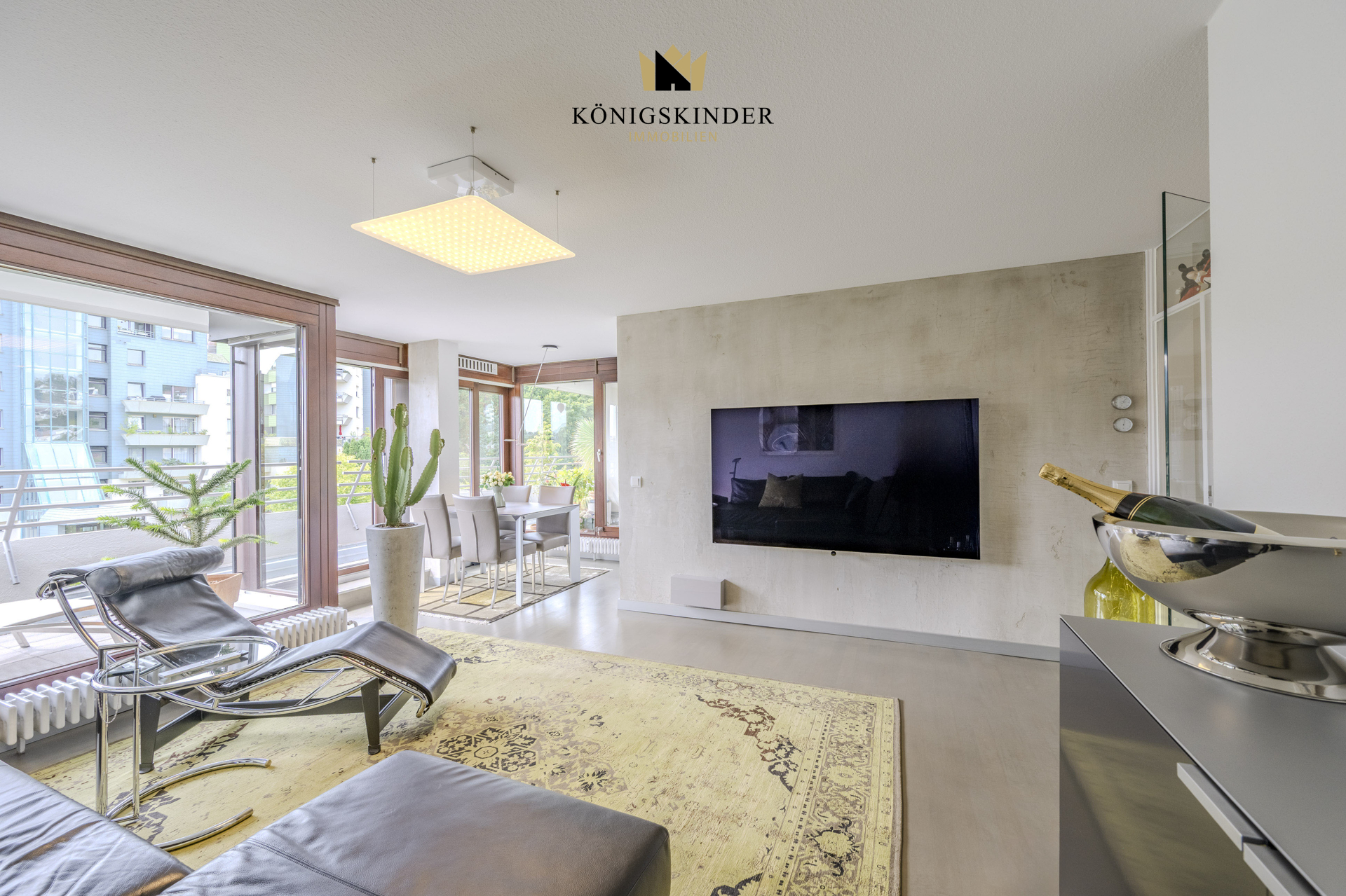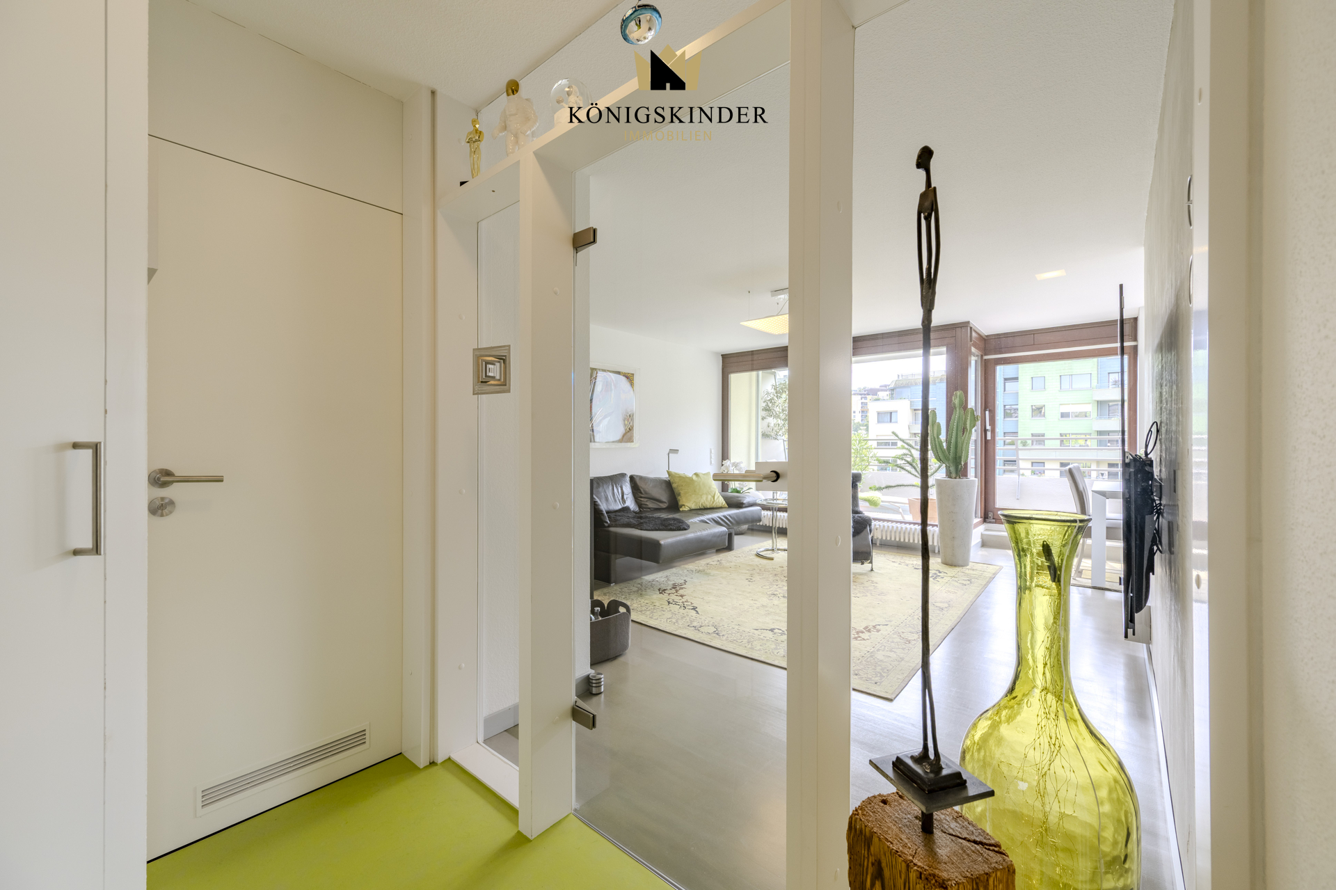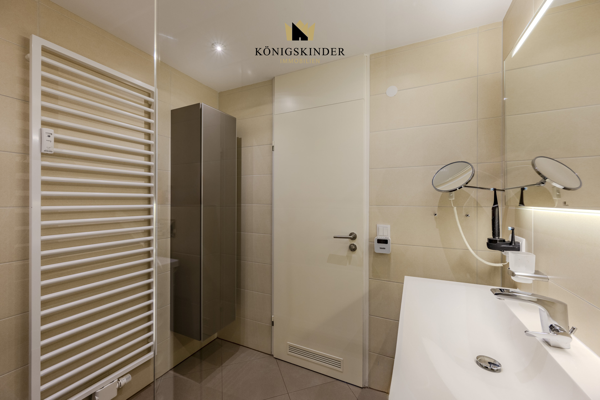 Betritt man die Wohnung, wird man von der modernen Garderobe empfangen, dieser gegenüber liegt das Schlafzimmer und daneben das separate Gäste-WC. Der großzügige und modern geschnittene Wohn- und Essbereich besticht mit Echtholzparkett, großen, bodentiefen und lichtdurchfluteten Fensterelemten. Alle Fenster verfügen über elektrischen Rollläden.