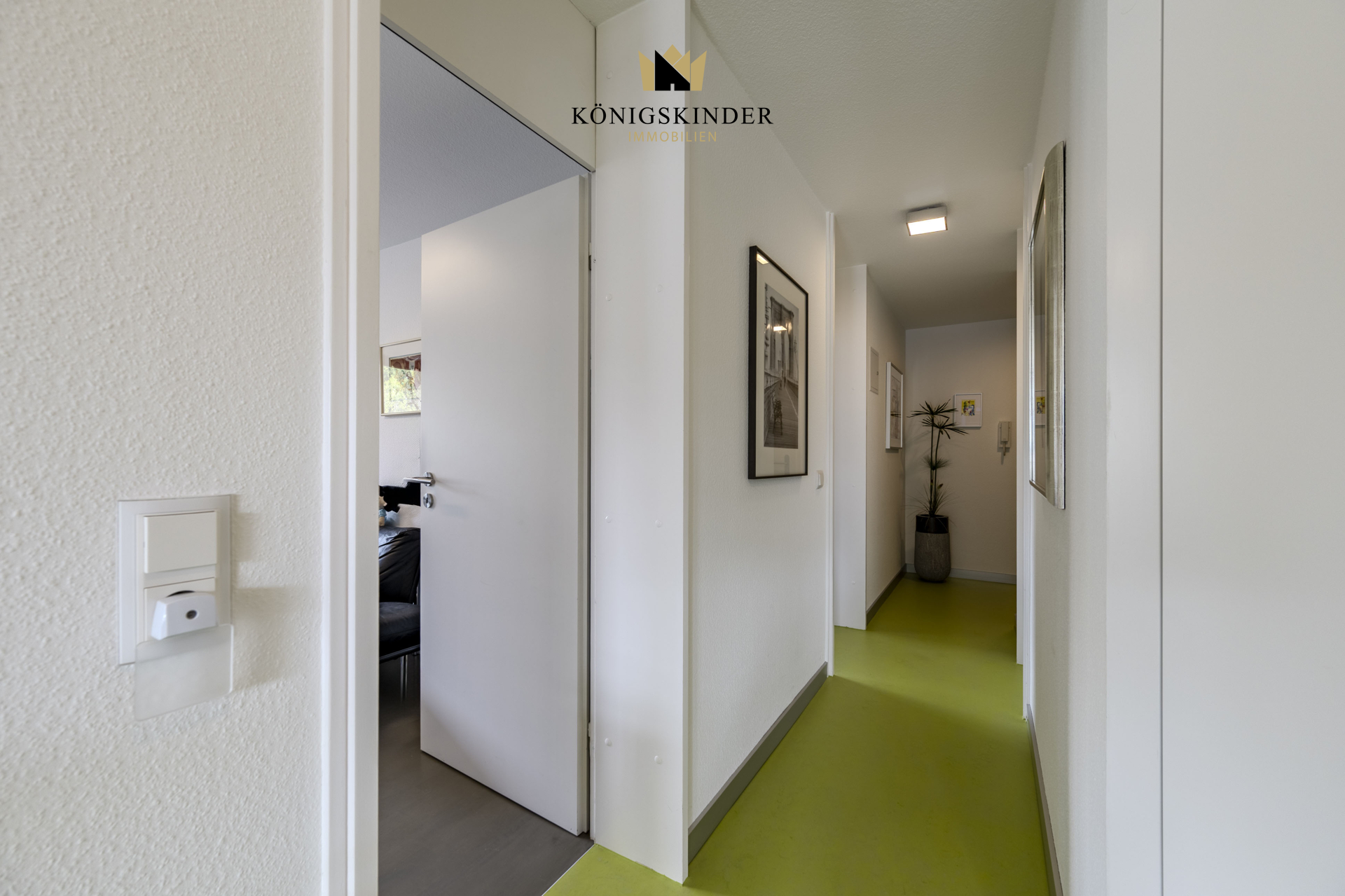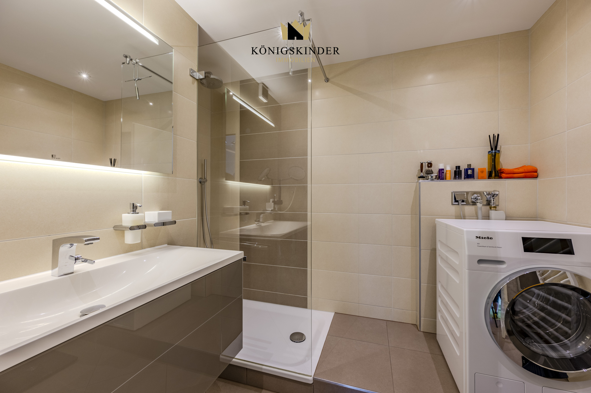 Ein Flur, welcher über einen Einbauschrank zur Aufbewahrung von Haushaltsgeräten verfügt, führt zum Hauptbad und zum Schlafzimmer. Das Bad verfügt über eine bodentiefe Dusche und über einen Handtuch-Heizkörper und bietet genügend Platz für eine Waschmaschine und einen Trockner bzw. ein Kombigerät. Das Schlafzimmer hat eine ausreichende Größe und verfügt über Kleiderschränke.
