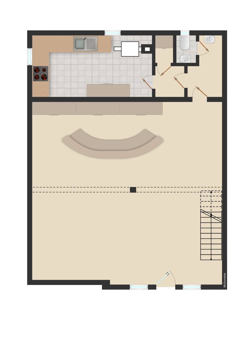 Über den separaten Eingang betreten Sie das repräsentative Erdgeschoss, welches ideal zu Ausstellungszwecken, als Besprechungsräumlichkeit oder als Empfang genutzt werden kann, je nach Bedarf. Hier befinden sich außerdem das WC, der Abstellraum und die Küche.
