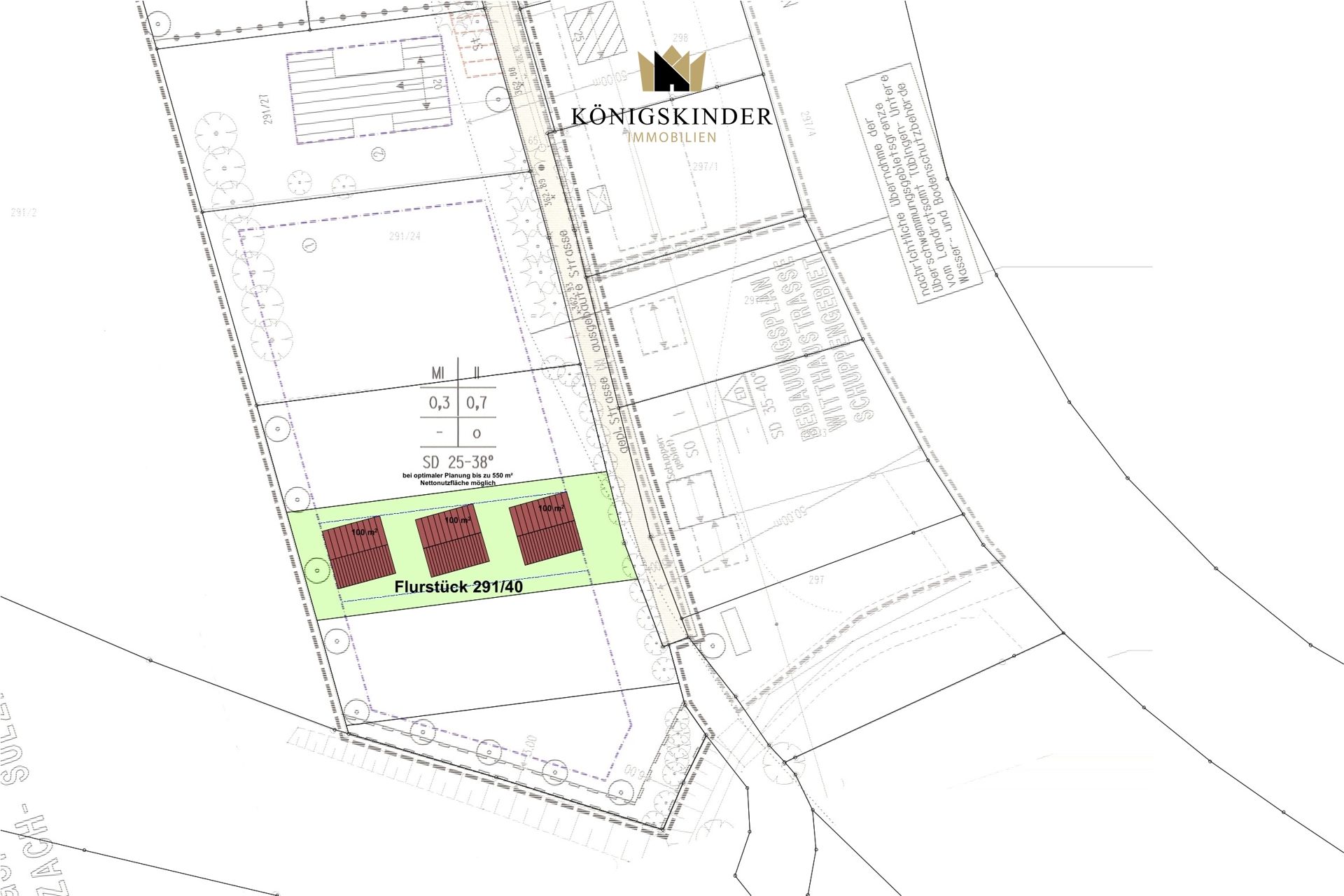 Das Grundstück bietet durch seine Ausweisung als Mischgebiet (MI) gemäß § 6 BauNVO ein breites Spektrum. Durch die künftige Bahnhaltestelle eignet sich der Standort auch hervorragend für kleinteiligen Einzelhandel oder Dienstleister, die von der neuen Frequenz profitieren möchten (z. B. ein Café, ein spezialisierter Bike-Shop oder eine Praxis). •Erschließung: Voll erschlossen (Abwasser-Revisionsschacht, Elektro, Glasfaser-Leerrohre vorhanden) •GRZ: 0,3 (300 m² Grundfläche) •GFZ: 0,7 (ca. 700 m² Geschossfläche) •Bauweise: Zweigeschossige, offene Bauweise; Satteldach (25°–38°).