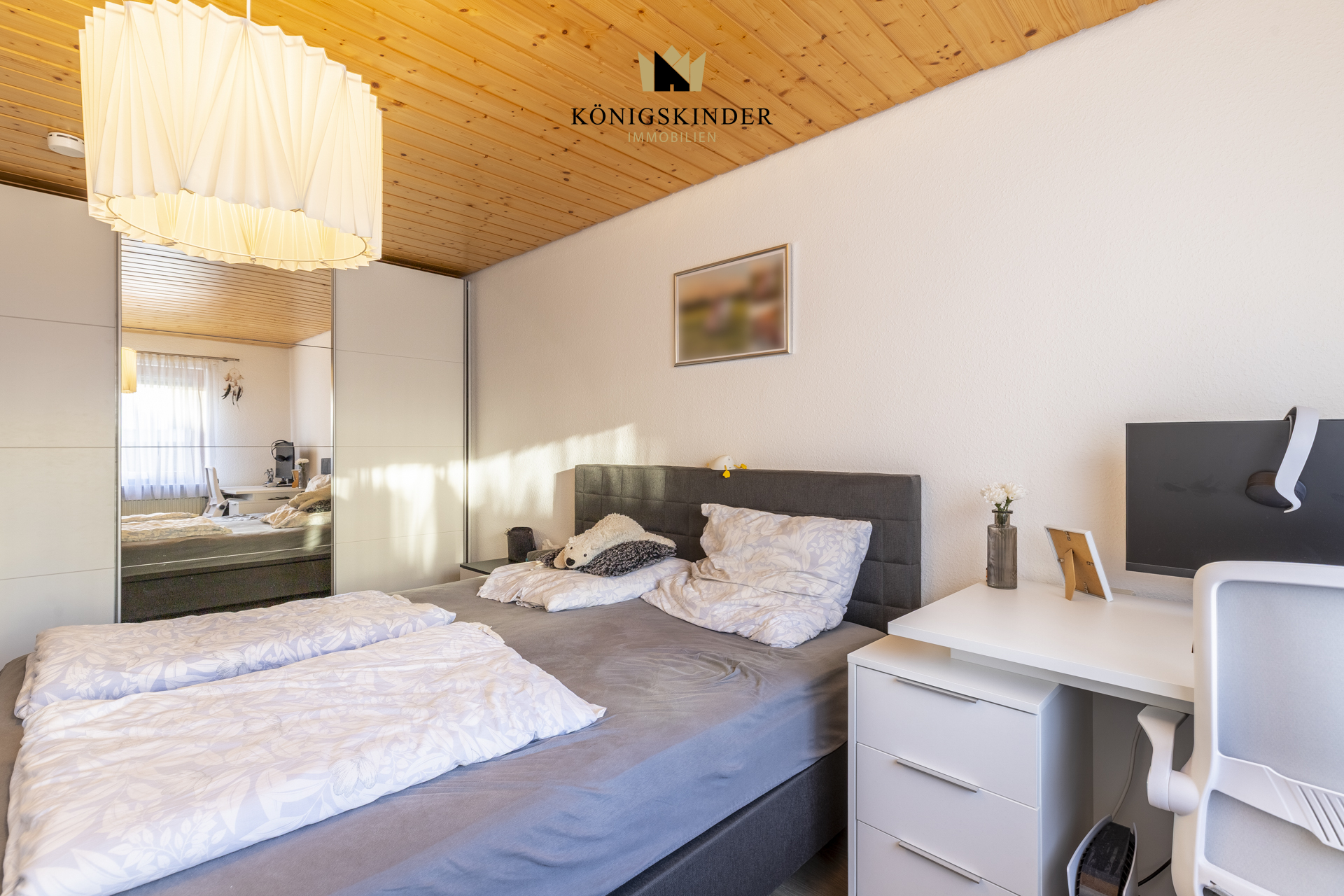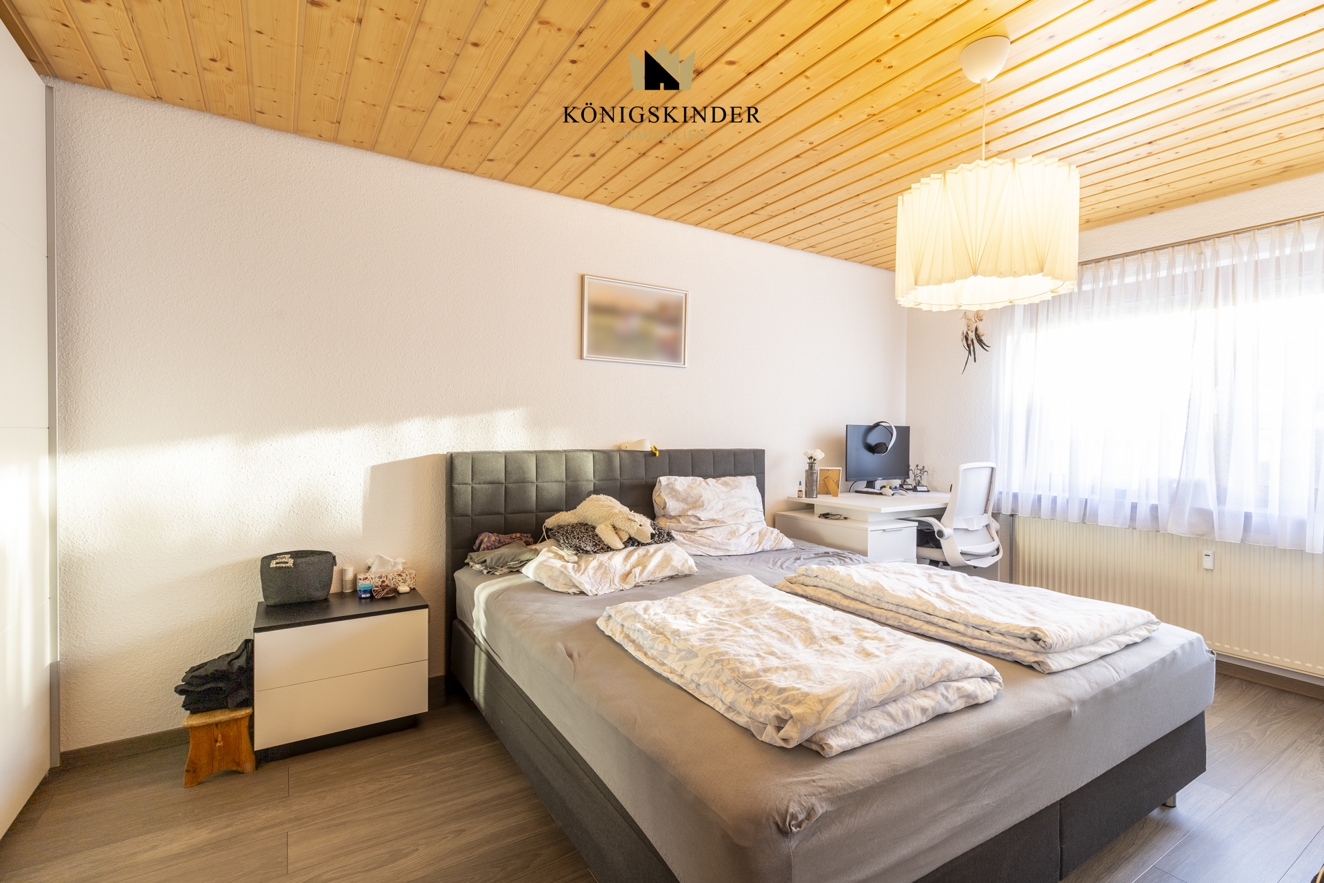 Das Schlafzimmer präsentiert sich ruhig und bietet genügend Platz für ein großes Bett sowie einen Kleiderschrank. Auch hier sorgen Fensterflächen für eine angenehme Belichtung und ein freundliches Raumgefühl.