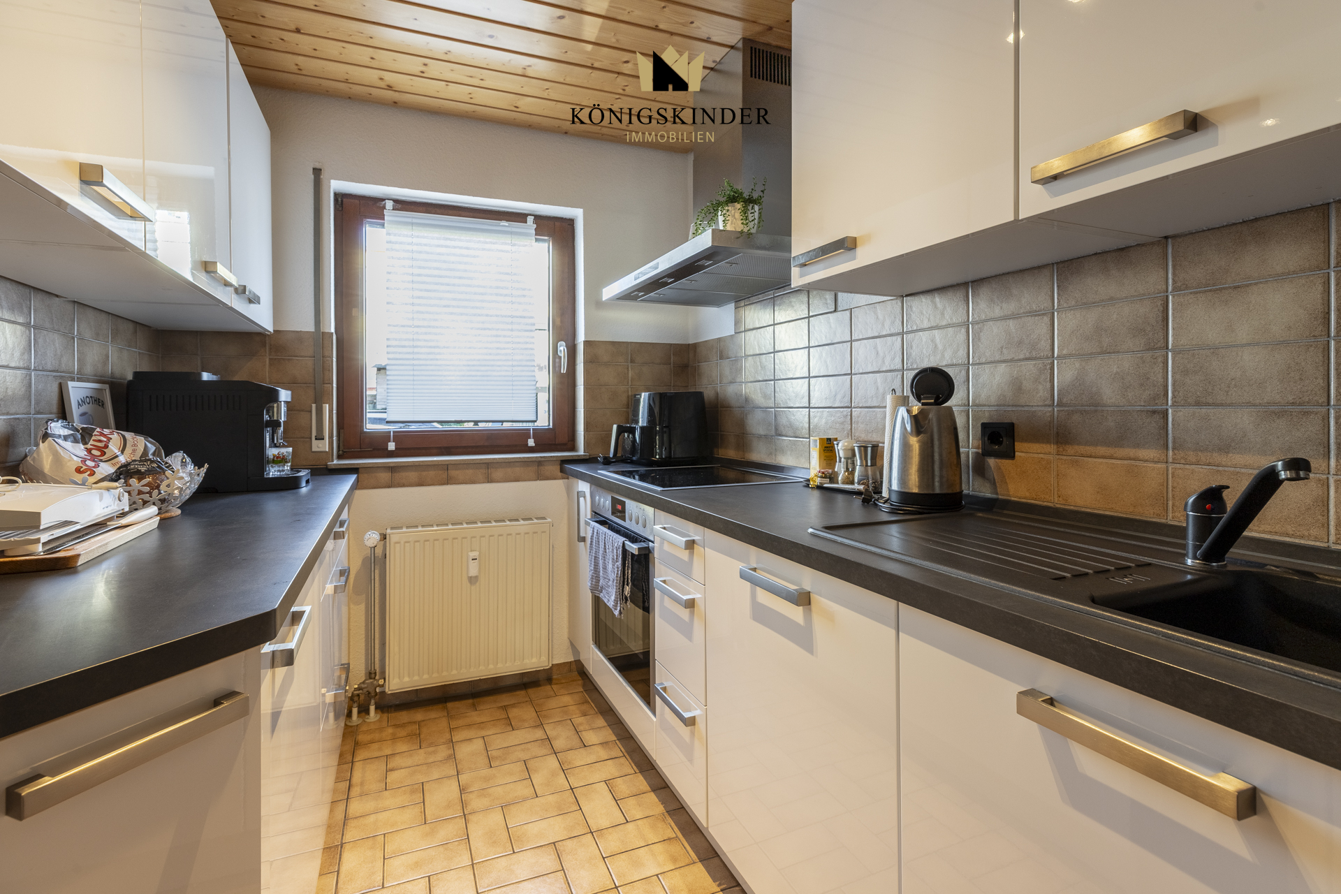 Die gepflegte Einbauküche mit hellen Fronten und dunkler Arbeitsplatte bietet ausreichend Stauraum sowie praktische Arbeitsflächen. Durch das vorhandene Fenster wirkt der Raum angenehm hell und lässt sich gut belüften.
