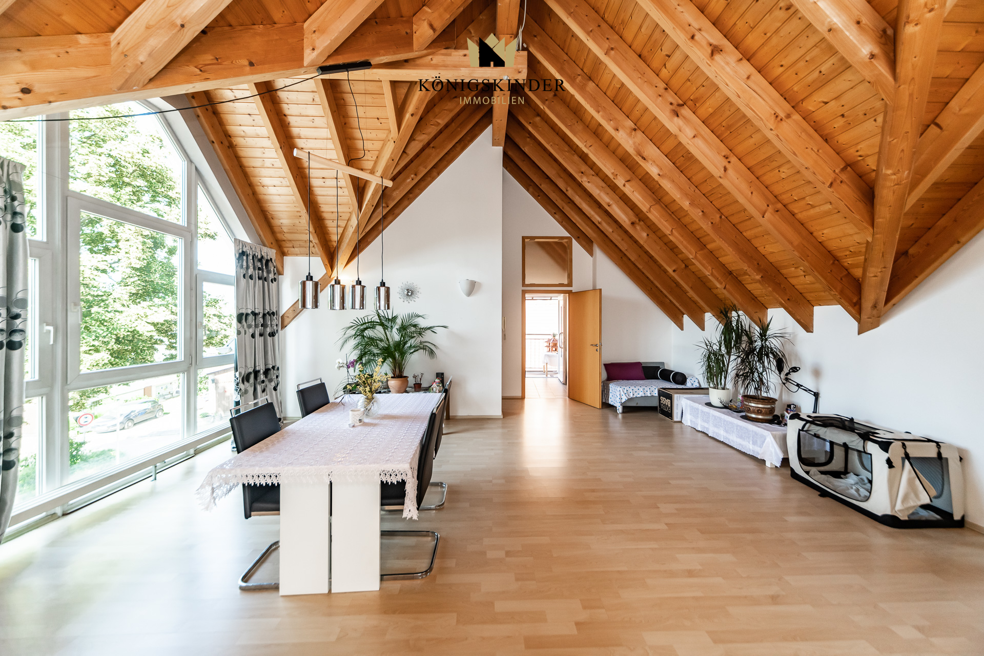 Das erwartet Sie: Lichtdurchflutetes Wohnen unter dem Dach Der offene Wohn- und Essbereich beeindruckt mit großflächiger Fensterfront, hoher Decke und freigelegtem Sichtgebälk. Die Architektur unter dem Satteldach verleiht der Wohnung ein luftiges, großzügiges Wohngefühl mit besonderem Charakter.