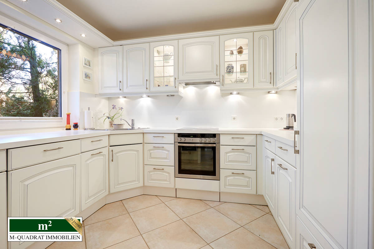 Die helle Nolte Marken-Küche im charmanten Landhausstil überzeugt mit viel Stauraum und stilvollen, beleuchteten Vitrinen. Der Blick in den angrenzenden grünen Wald macht das Kochen hier zu einem besonderen Genuss – ein Ort, an dem man gerne verweilt und kreativ wird. Auf dieser Ebene rundet ein ebenfalls 2012 neugestaltetes Gäste-WC das Raumangebot ab.