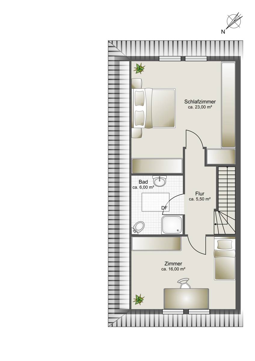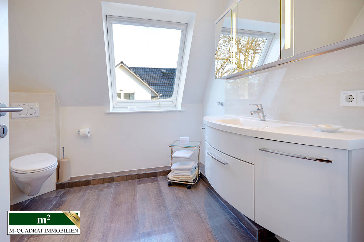 Über eine massive Steintreppe im Wohnbereich, gelangen Sie in das Dachgeschoss, den privaten Rückzugsbereich des Hauses. Zwei geräumige Schlafzimmer bieten vielfältige Nutzungsmöglichkeiten. Dezent integrierte Einbauschränke und Regale schaffen praktischen Stauraum, ohne den offenen Raumeindruck zu beeinträchtigen. Das großzügige Hauptschlafzimmer mit ca. 23 m² lässt sich bei Bedarf problemlos in zwei separate Räume unterteilen. Dank der besonderen Dachform wirken alle Zimmer angenehm hell und keinesfalls beengt. Ergänzt wird diese Ebene durch ein modernisiertes Duschbad mit Dachfenster, das 2012 zeitgemäß erneuert wurde.