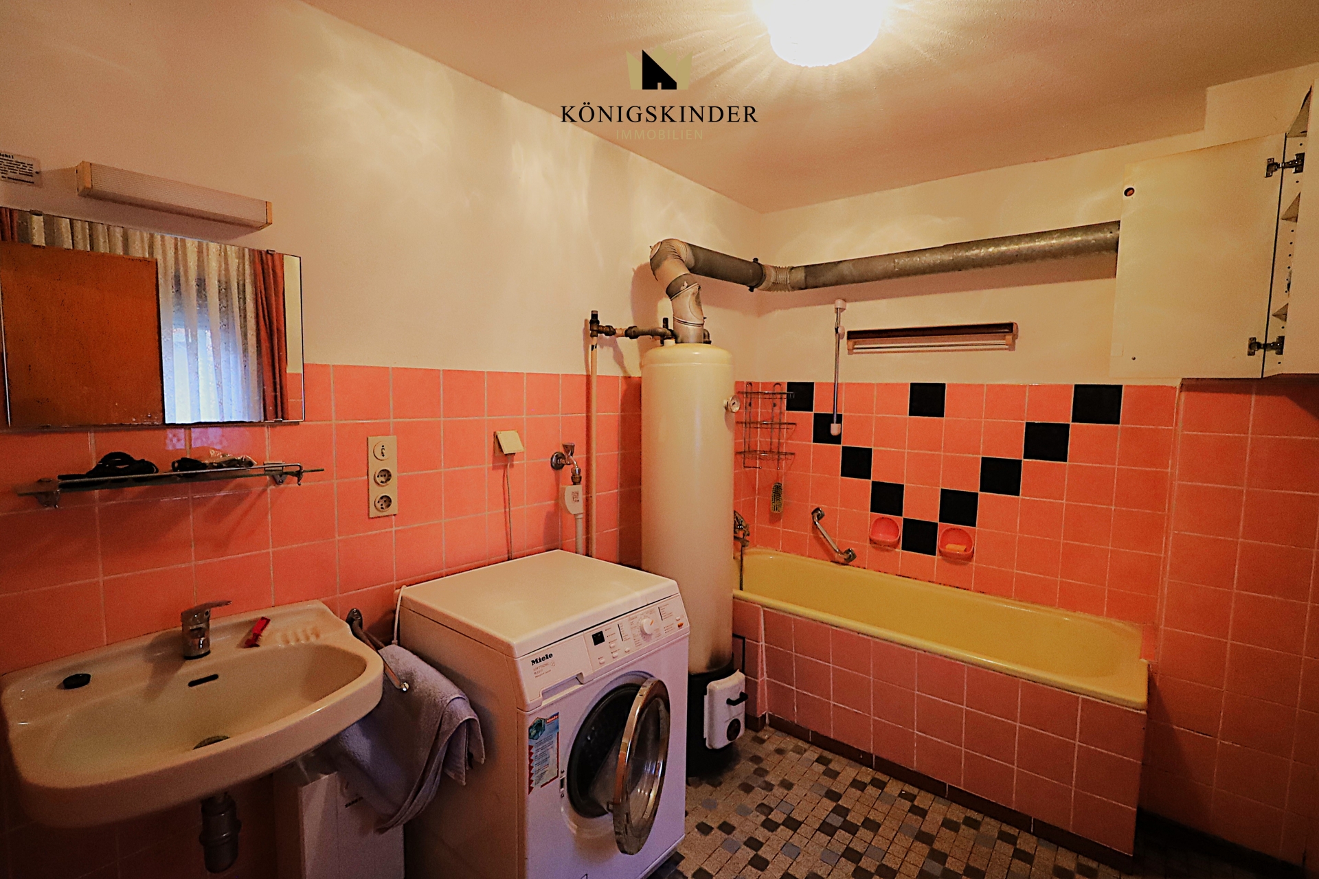 Im Erdgeschoss, erreichbar über zwei Treppen von der Seitenstraße aus und eine Zufahrt, befinden sich zwei Zimmer, die Wohnküche, ein Zwischenraum als Hauswirtschaftsraum, das Bad und das separate WC.