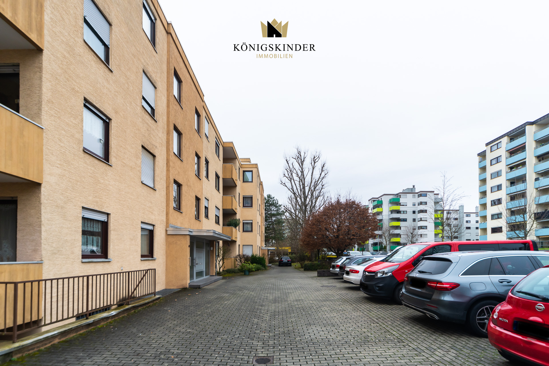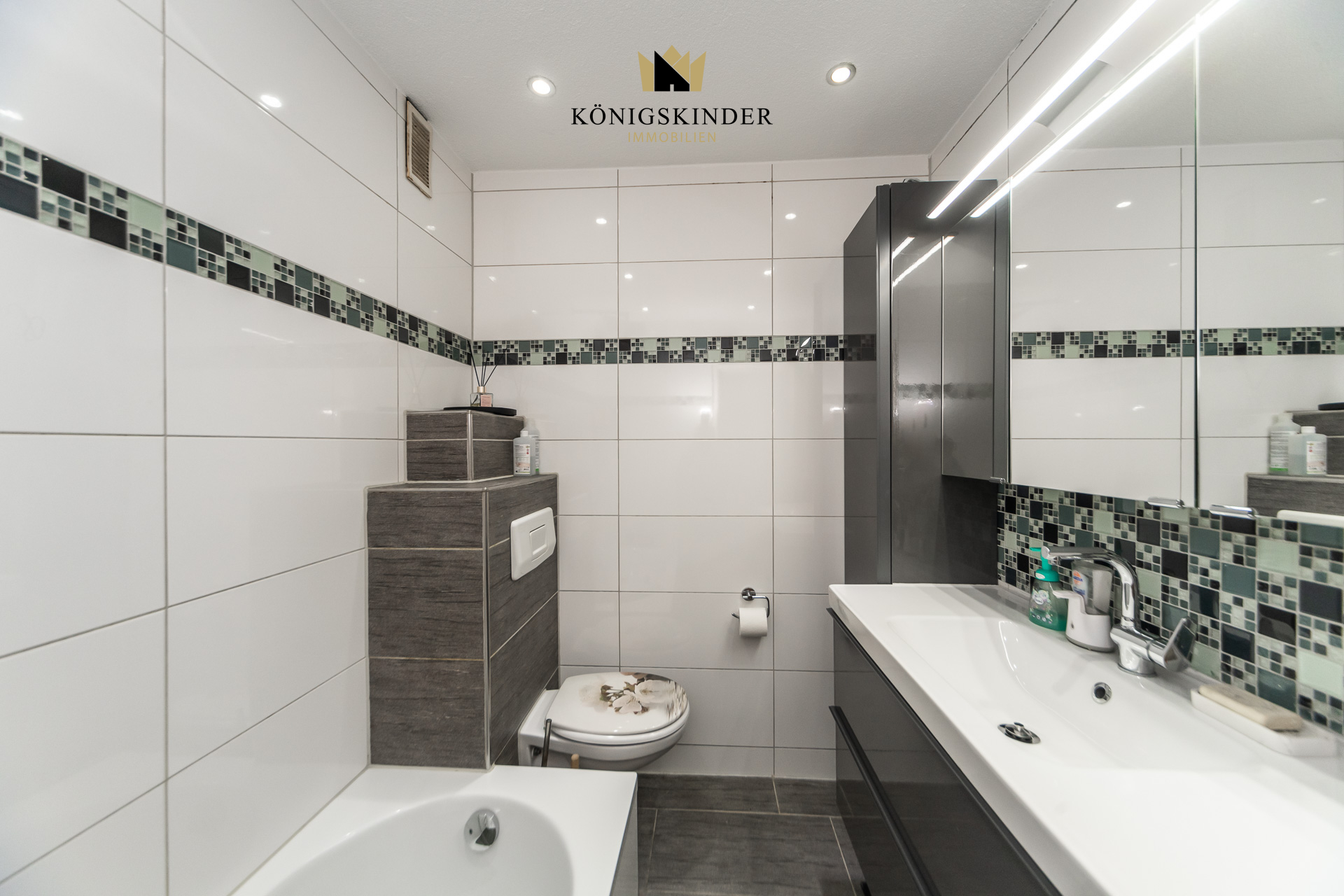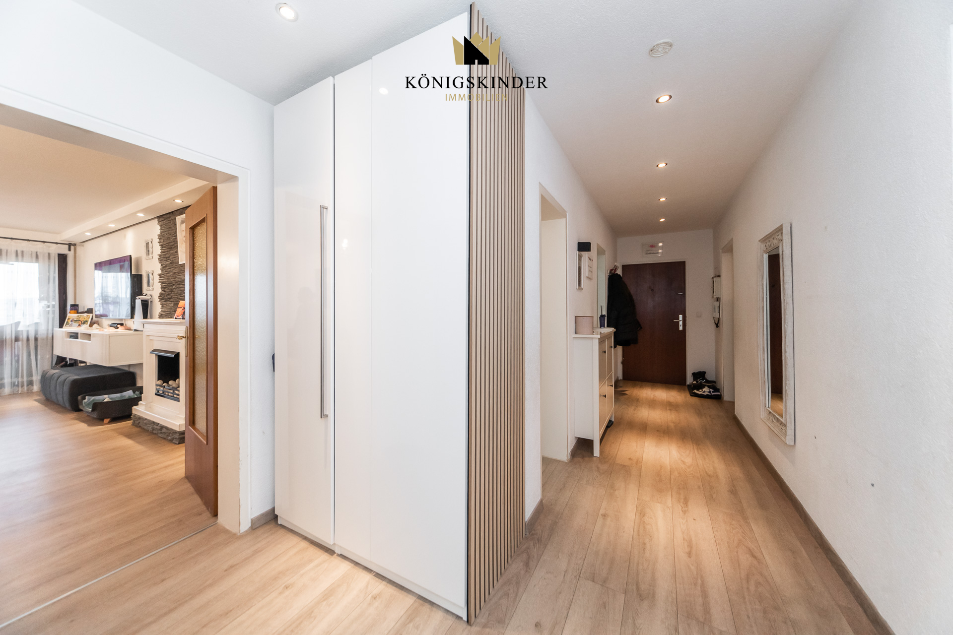 Der Flur als Empfangsbereich bildet das Zentrum der Wohnung, von dem man in alle Zimmer gelangt. Links befinden sich das Kinderzimmer und das Schlafzimmer, rechts das neu renovierte Bad und das Gäste-WC. Am Ende des Flurs gelangt man in die neue Küche, den Abstellraum und in den sehr großzügigen Wohn- und Essbereich mit direktem Ausgang zum überdachten Balkon. Zur Wohnung gehören des Weiteren noch zwei großzügige Abstellräume im Keller und ein PKW-Stellplatz vor dem Haus.