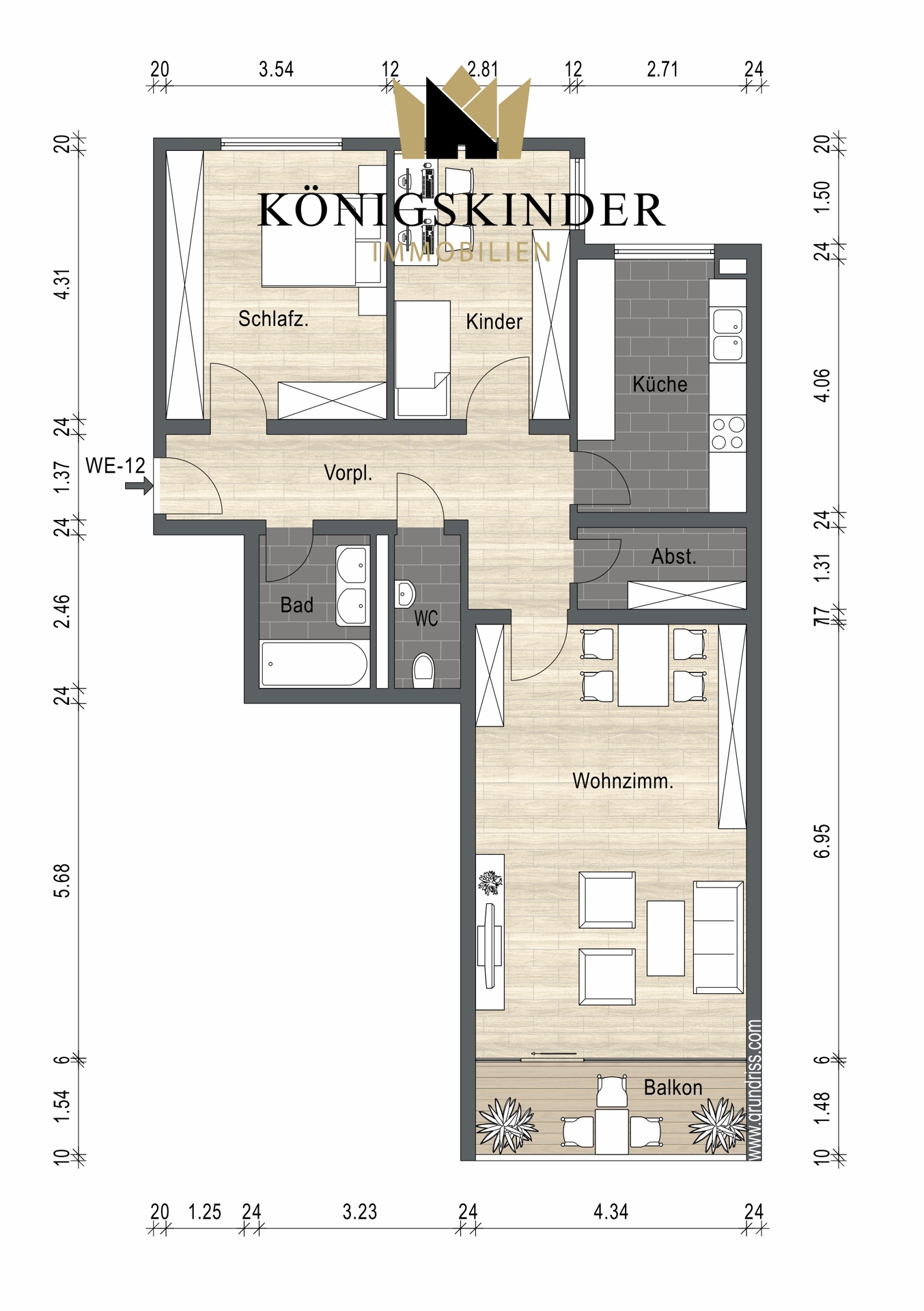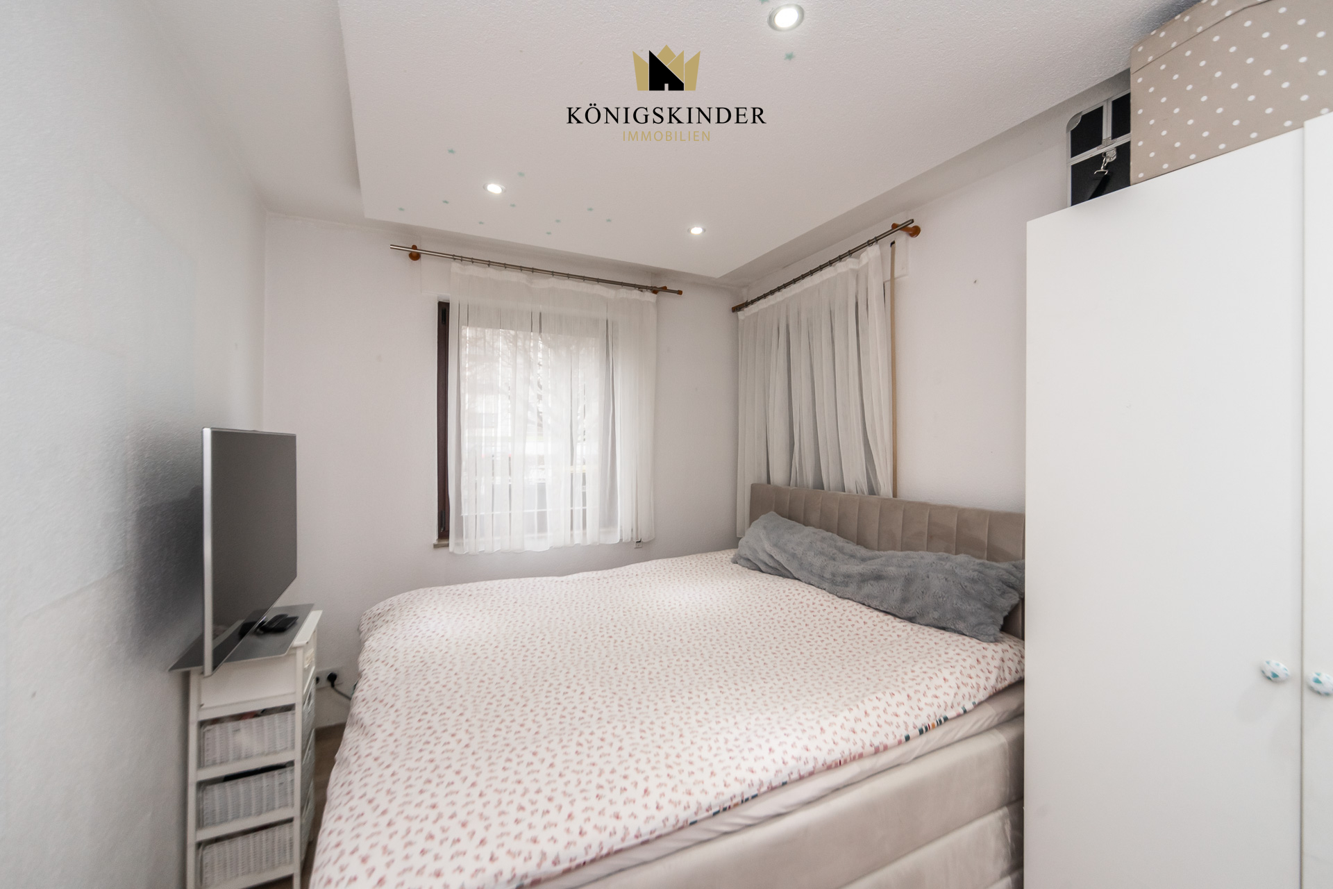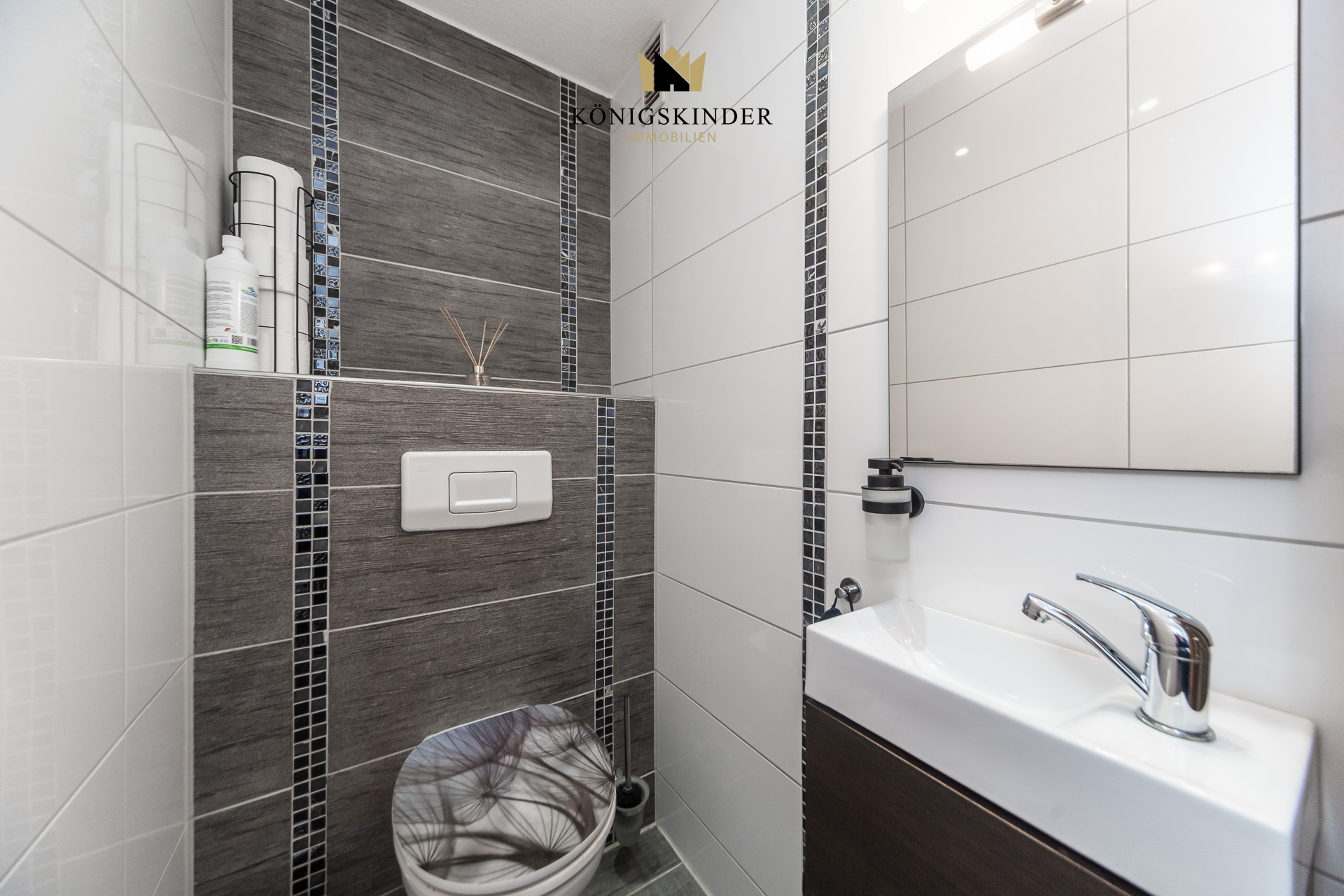 Der Flur als Empfangsbereich bildet das Zentrum der Wohnung, von dem man in alle Zimmer gelangt. Links befinden sich das Kinderzimmer und das Schlafzimmer, rechts das neu renovierte Bad und das Gäste-WC. Am Ende des Flurs gelangt man in die neue Küche, den Abstellraum und in den sehr großzügigen Wohn- und Essbereich mit direktem Ausgang zum überdachten Balkon. Zur Wohnung gehören des Weiteren noch zwei großzügige Abstellräume im Keller und ein PKW-Stellplatz vor dem Haus.