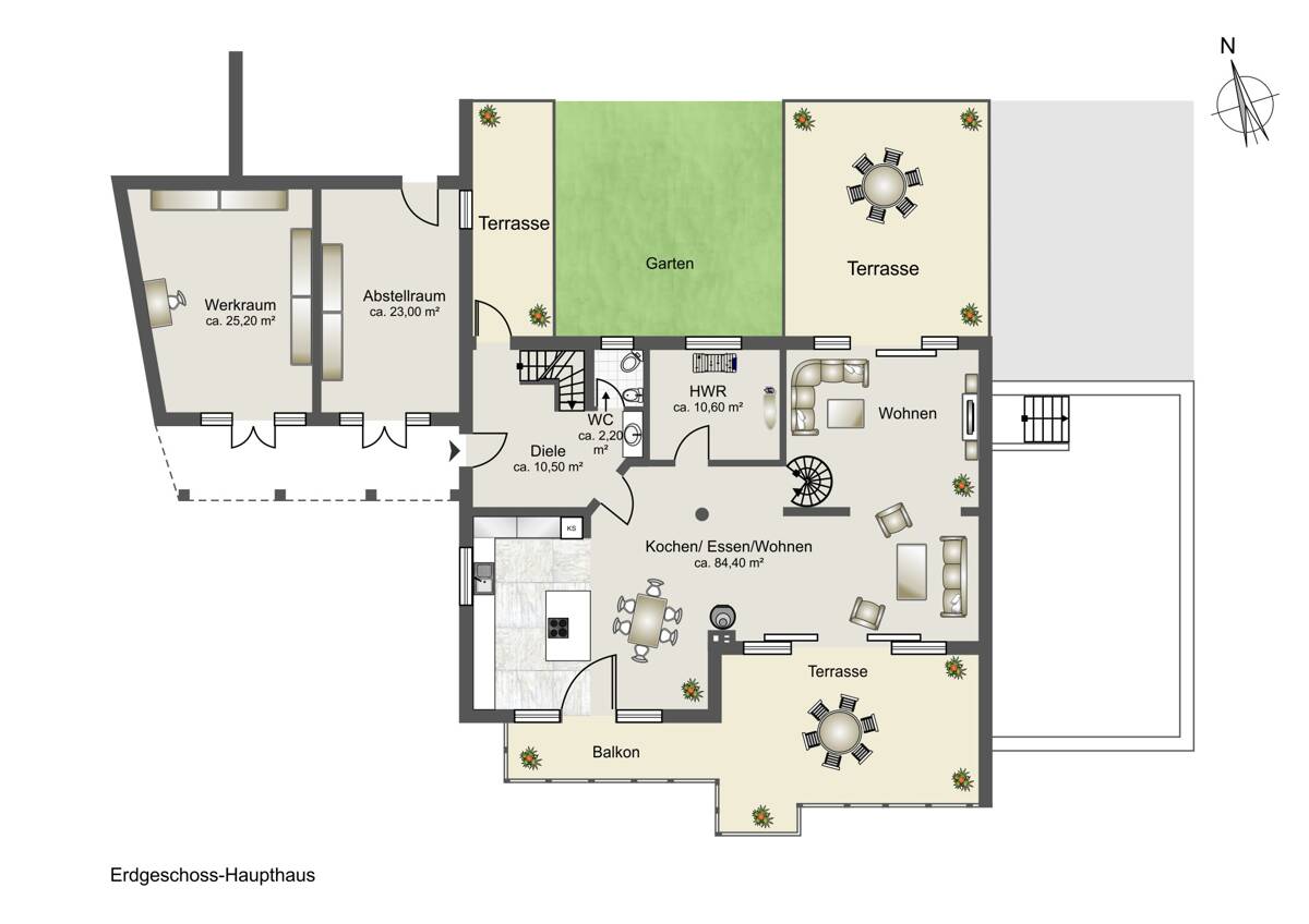 Das Erdgeschoss des Haupthauses wurde im Jahr 2016 umfassend modernisiert. Der Grundriss präsentiert sich offen, modern und lichtdurchflutet. Eine Fußbodenheizung sorgt für höchsten Wohnkomfort, ebenso wie die exklusive, maßgefertigte Küche mit Kochinsel. Ausgestattet mit einem BORA-Kochfeld mit integrierter Abluft, einem großen Standkühlschrank mit Eiswürfelbereiter und hochwertigen Einbaugeräten erfüllt sie höchste Ansprüche. Der angrenzende Balkon sowie die Südterrasse mit Außenkamin laden zu entspannten Stunden und stilvollen Abenden ein.