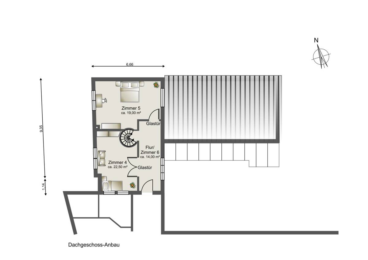 Haupthaus – Dachgeschoss •Offene Küchenzeile •Wohnbereich mit Spindeltreppe zum Erdgeschoss •Kaminofen •Gäste-Badezimmer mit Dachfenster (derzeit ohne Dusche) •Teppichböden in den Wohnräumen •Schlafzimmer mit separater Ankleide und En-Suite-Vollbad •Südbalkon vor dem Schlafzimmer •Dielenboden in der Dachgeschosserweiterung •Sämtliche Fenster mit 3-fach-Verglasung