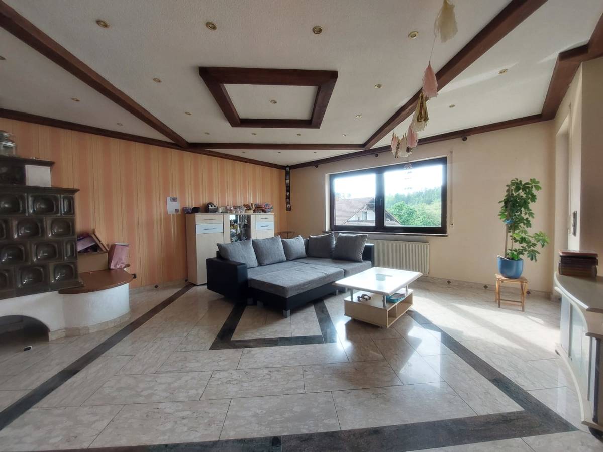Die Immobilie verfügt über zwei Eingänge: Souterraineingang: Sie erreichen die innenliegende Garage, Vorratslager, HWS-Raum mit Dusche, WC separat, Flur, Heizraum, Tankraum, Hausanschlussraum; weiter geht es zur mittleren Ebene, die Sie sowohl über die Innen-Treppe, als auch von außen über die Haupteingangstür erreichen. Hier öffnet sich im EG ein großzügiger Eingangsbereich. Sie finden ein Gästebad, das Familienbad, ein Schlafzimmer, die Küche mit Speisekammer vor. Der großzügige Balkon wird vom Wohn-Esszimmer und Schlafzimmer erreicht . Das Wohnzimmer verfügt über einen imposanten Kachelofen, der neben der Zentralheizung eine wohlige Wärme ausstrahlt. Sowohl in den Bädern, der Diele und im Wohn-Ess-Zimmer wurde der Fußboden mit einem hochwertigem Granitboden versehen. Eine Besonderheit strahlt von der Wohnzimmer-und Dielen-Decke aus, diese sind mit kreativen Holzelementen und Beleuchtung versehen. Über die offene Treppe,- die Treppenstufen sind auch hier aus hochwertigem Granit gefertigt, erreichen Sie die Diele im OG, diese führt zu einem Arbeitszimmer mit schönem Parkettfußboden; ein Duschbad und ein weiteres Zimmer schließen sich an. Die Loggia mit Weitblick ergänzt das schöne Wohngefühl. Zusätzlich ist über eine Bodentreppe ein Dachboden zu erreichen.Zurück zum Eingangsbereich, von dort gelangen wir hinaus zur Terrasse, gehen über den Rasen, kommen zum Gartenhaus und erreichen den Garten mit angelegten Gartenteich.