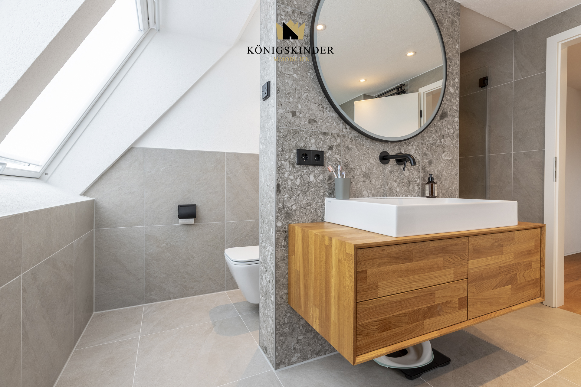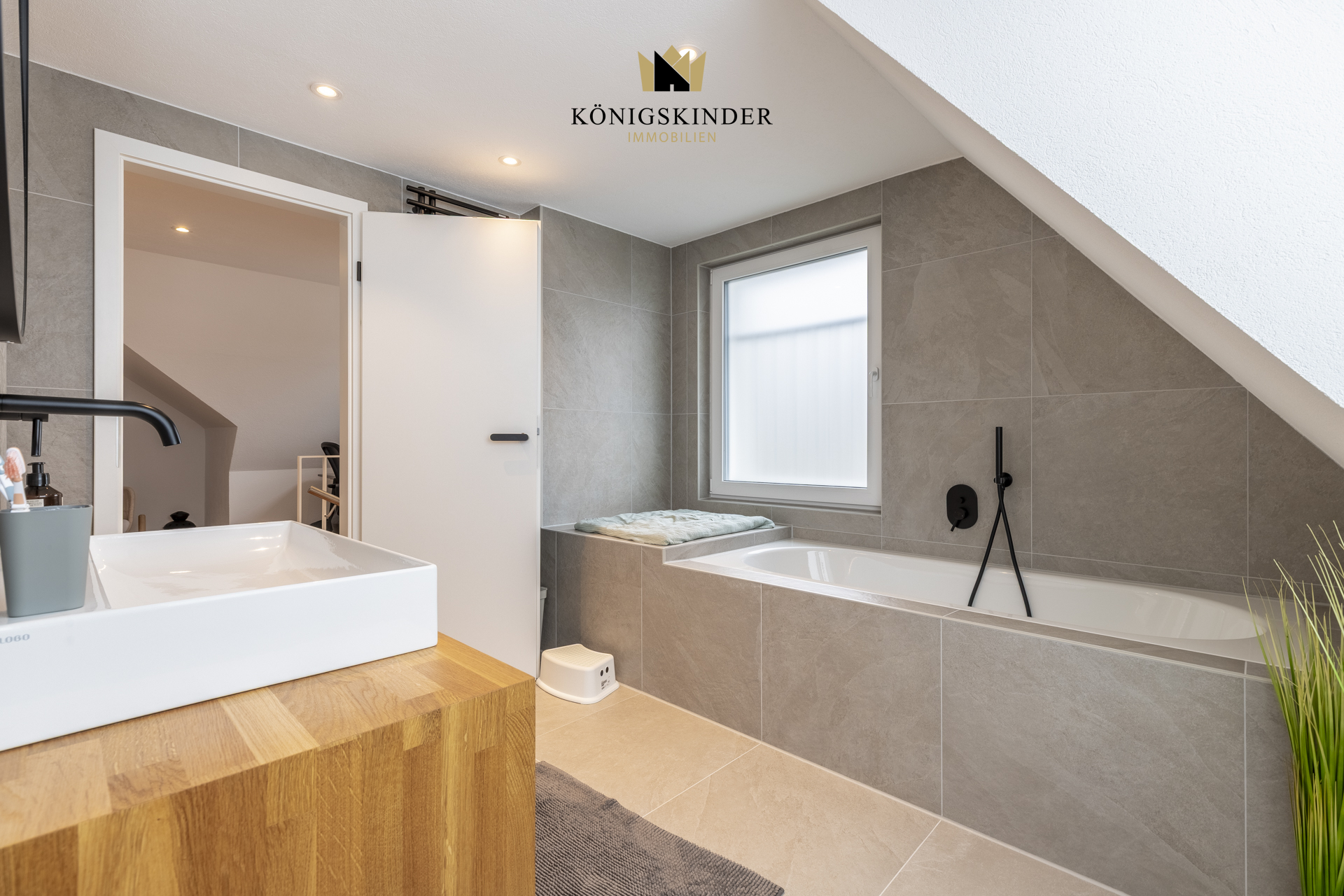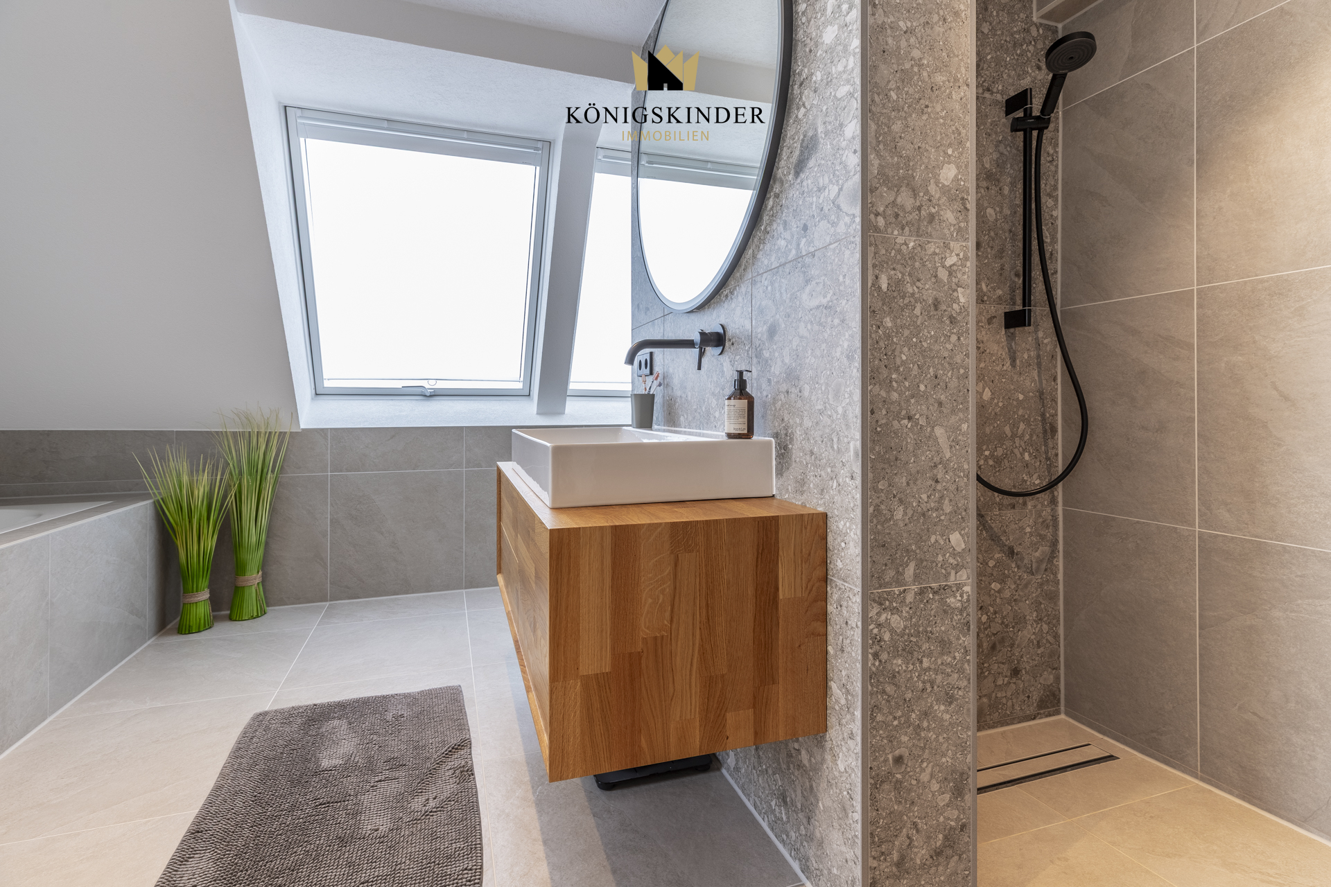 * Elegantes Tageslichtbad mit Badewanne, ebenerdiger Dusche und WC