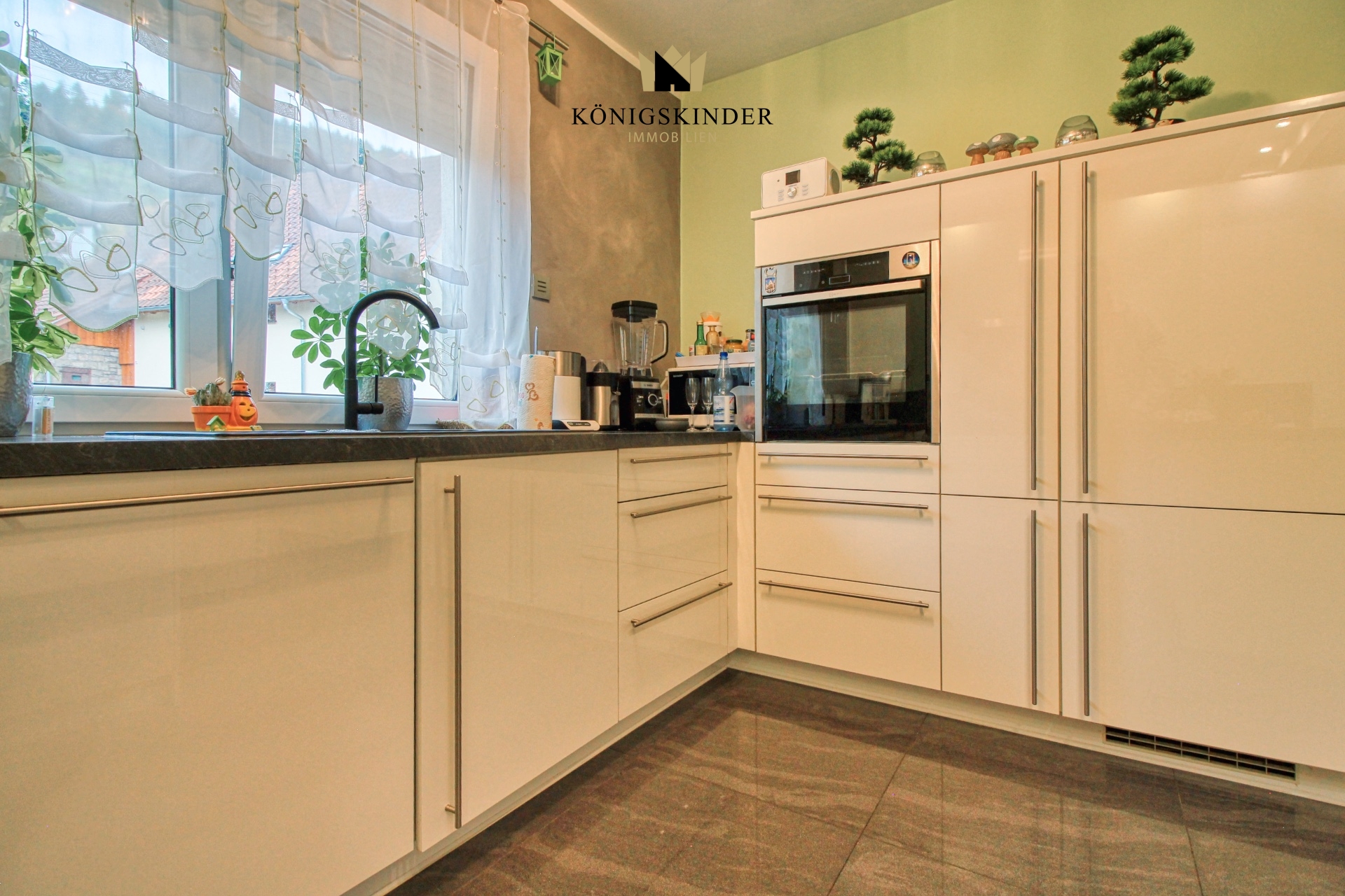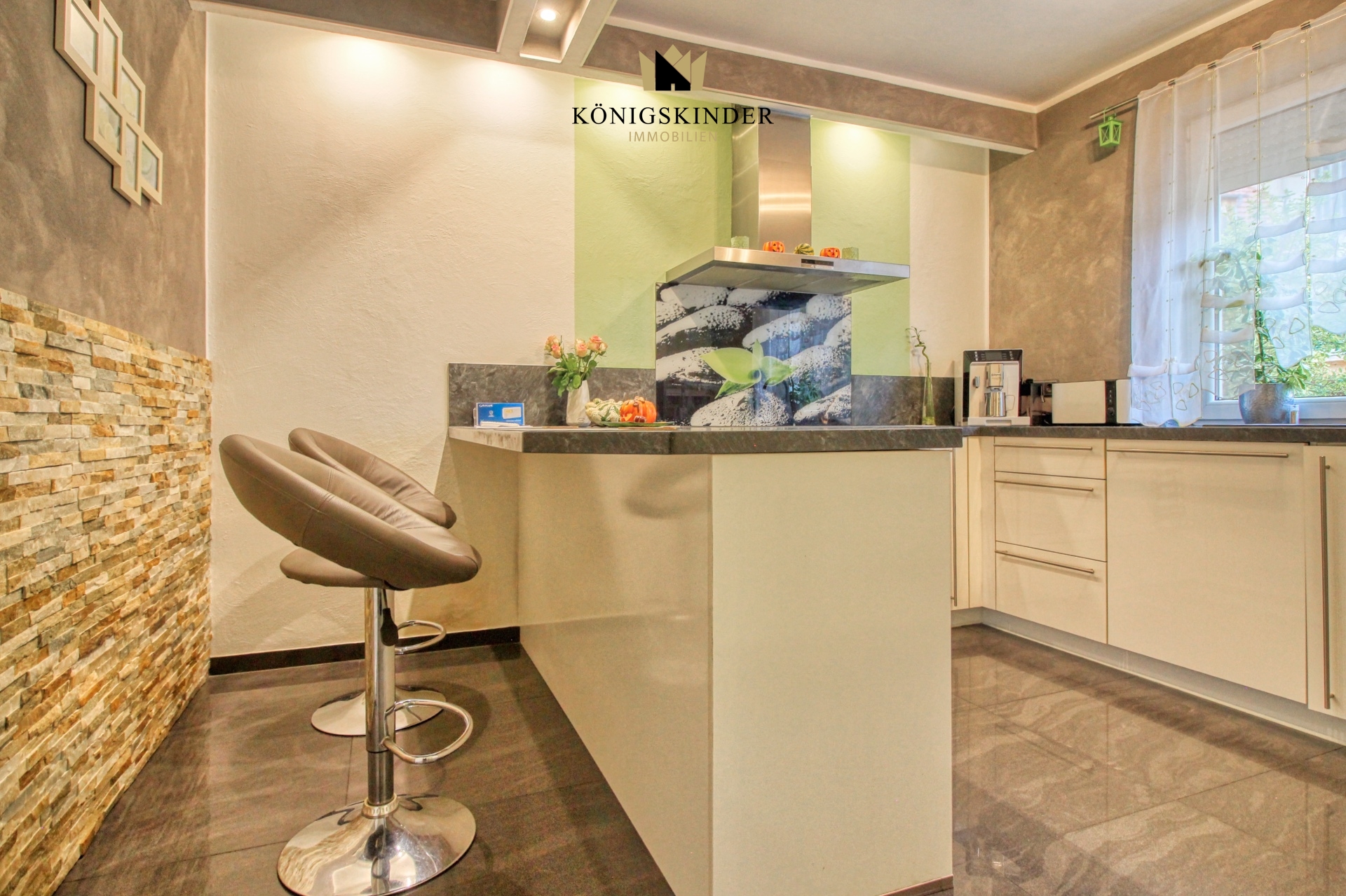 Die angrenzende Küche überzeugt mit klarer Ästhetik, hochwertigen Materialien und einer großzügigen Arbeitsfläche aus Naturstein, die sich elegant zu einer integrierten Sitzmöglichkeit erweitert – perfekt für den morgendlichen Kaffee oder ein Glas Wein beim Kochen. Hier verschmelzen Funktionalität und Stil zu einem modernen Lebensmittelpunkt.