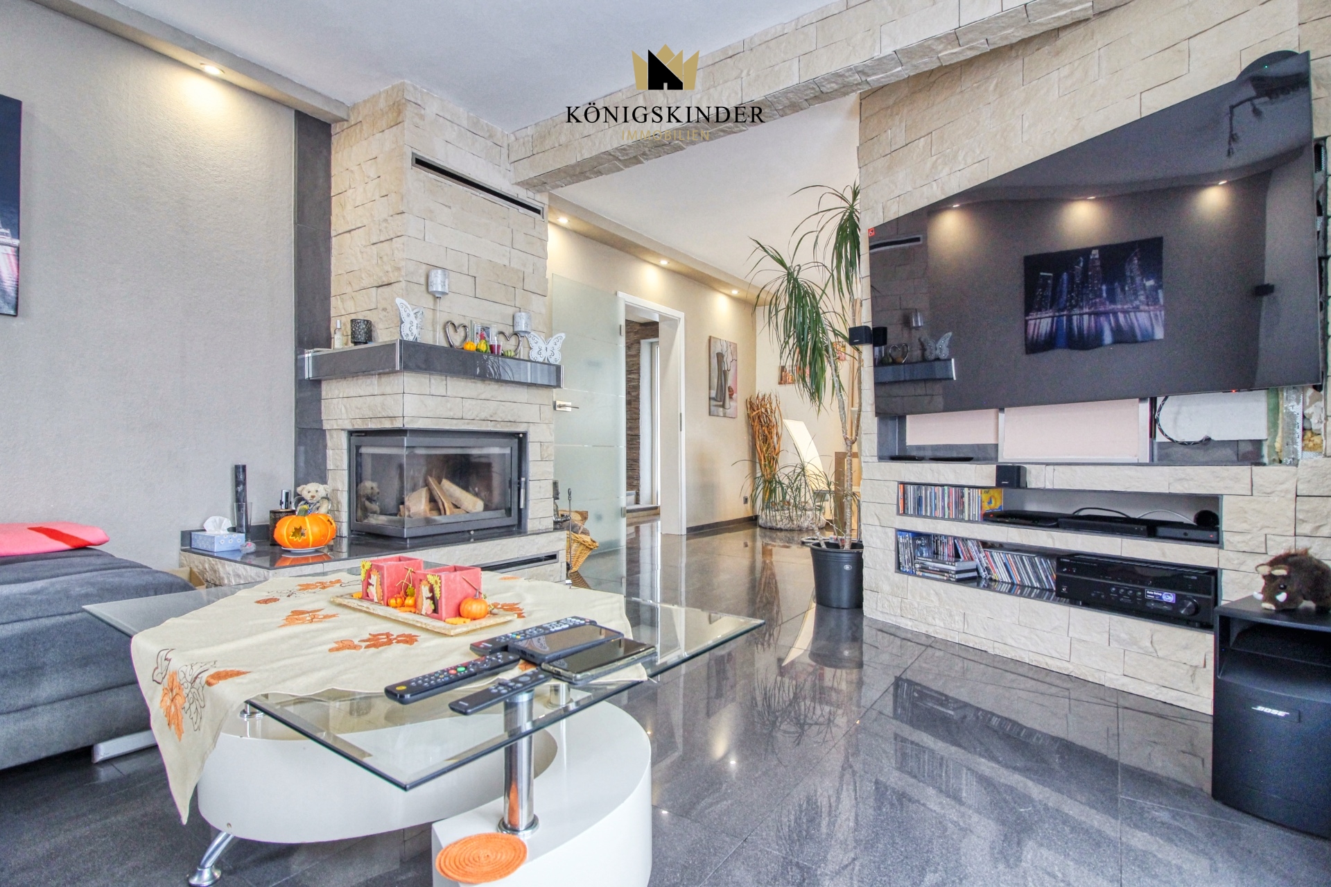 Bereits beim Betreten öffnet sich linker Hand ein großzügiger Wohn- und Essbereich, geprägt von klaren Linien, warmen Materialien und einer wohltuenden Ruhe. Mittelpunkt des Raumes ist der schmucke Kaminofen in heller Natursteinoberfläche – ein Blickfang, dessen Material sich harmonisch an der Wohnzimmerwand fortsetzt und dem Raum eine edle, natürliche Note verleiht. Große Fensterflächen fluten diesen Bereich mit Licht und führen direkt auf die erhabene Terrasse – ein Ort mit Weitblick, im wahrsten Sinne des Wortes: Der Blick schweift über den Schwarzwald, majestätisch und beruhigend zugleich.