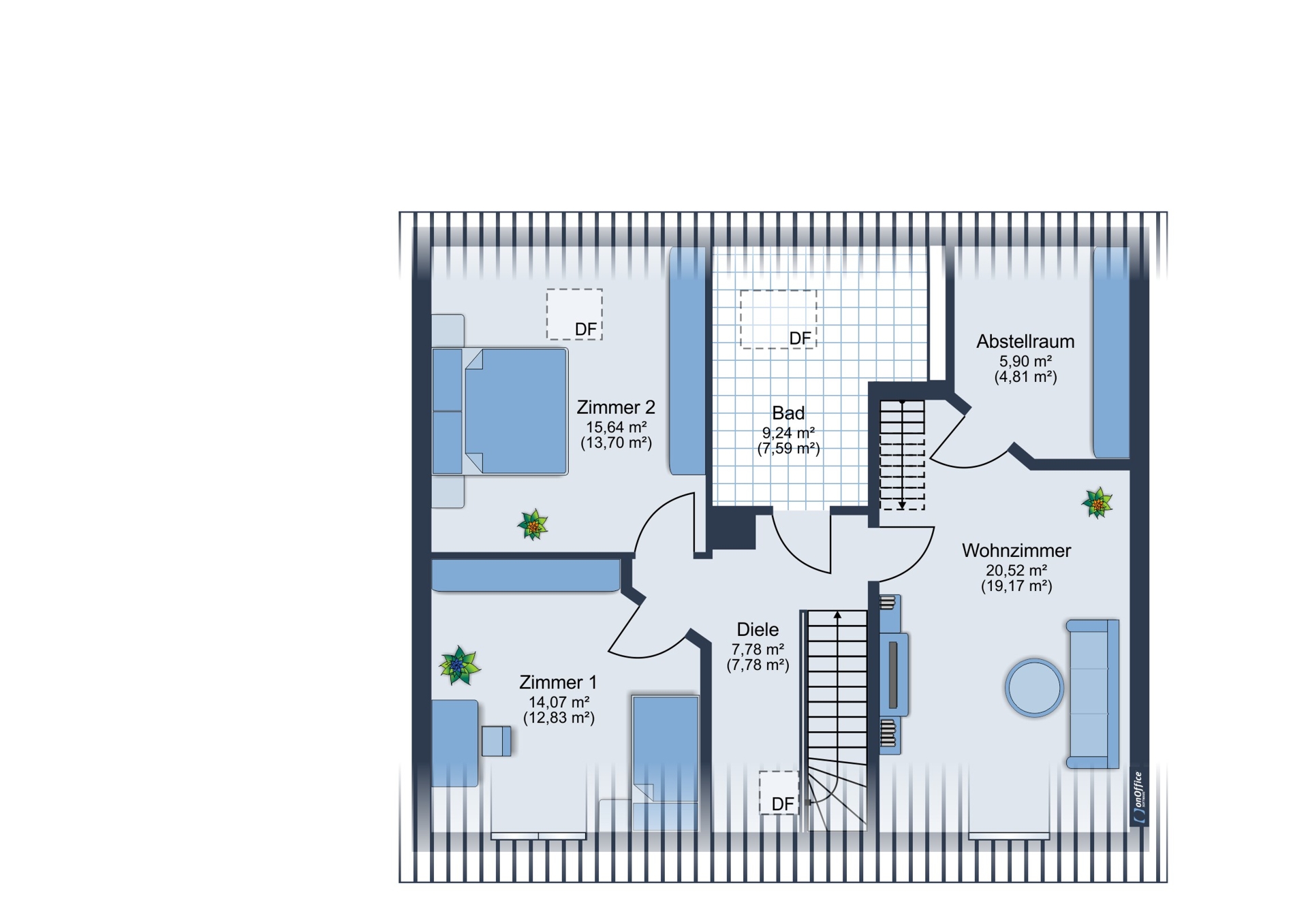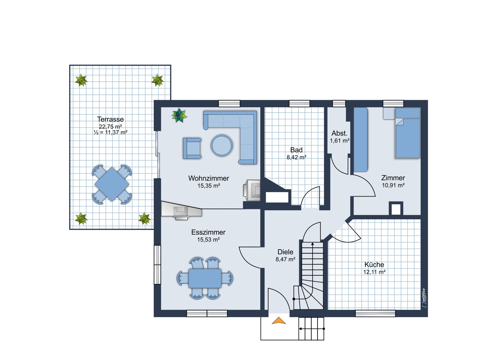 Ebenfalls im Erdgeschoss befinden sich ein geschmackvolles Gäste-WC, ein flexibel nutzbares Zimmer - ideal als Büro oder Gästezimmer - ein Bad mit ebenerdiger Dusche in edler Natursteinoptik sowie ein praktischer Abstellraum.
