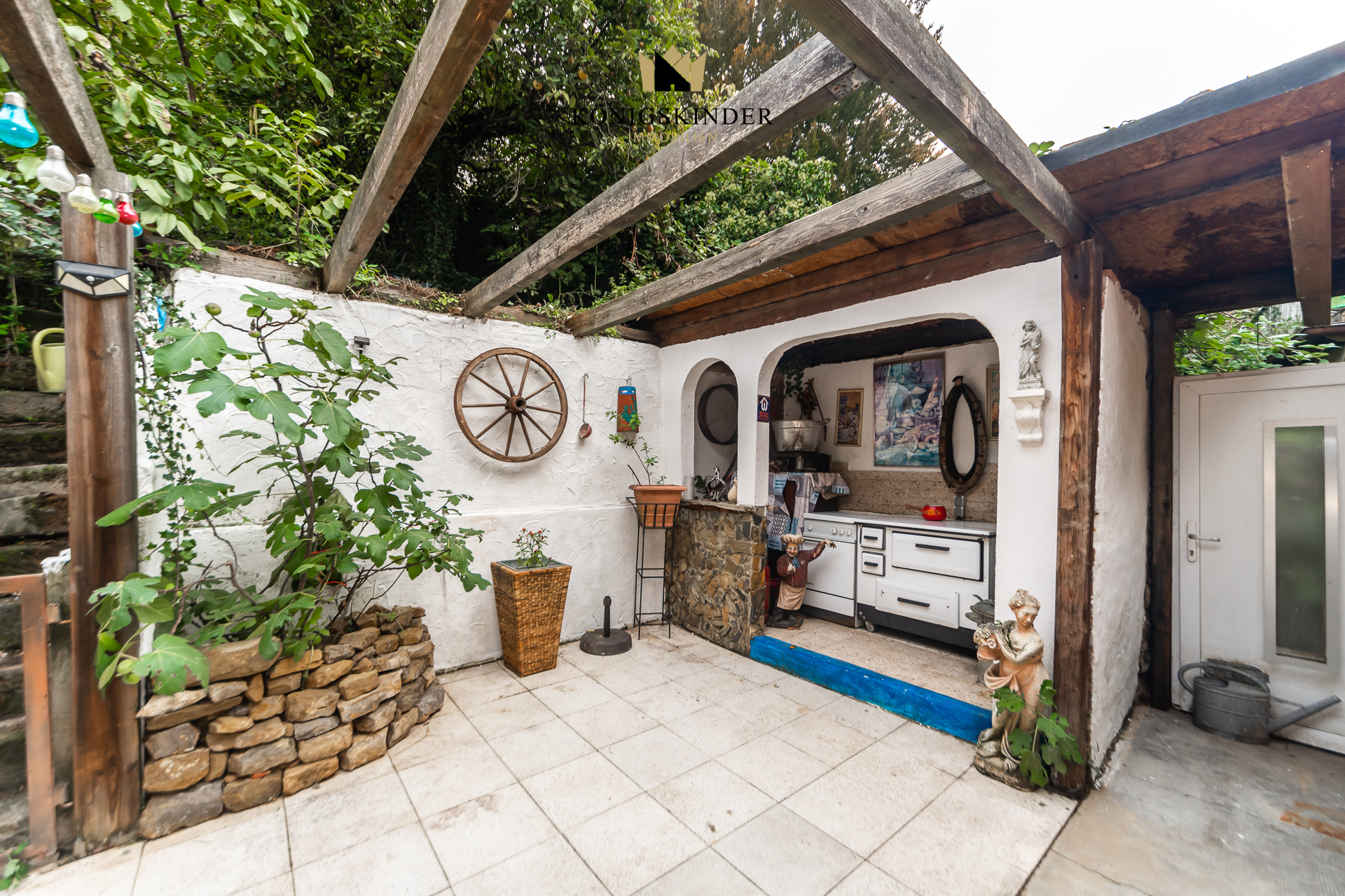 - 2 Terrassen (Süd- und Westausrichtung, zusammen ca. 55 m², anteilig anrechenbar) - gepflegter Gartenbereich mit Rasen, Zierpflanzen, Feigenbäumen und Sitzmöglichkeiten - Außenküche mit Steingrill – perfekt für gesellige Sommerabende - große Garage (ca. 33 m², Stromversorgung) - 3 Pkw-Stellplätze direkt am Haus - Scheune/Werkstattbereich mit vielseitigen Nutzungsmöglichkeiten (Lager, Hobby, Ausbaupotenzial) - 2 historische Gewölbekeller – ideal als Weinlager, Partyraum oder Stauraum