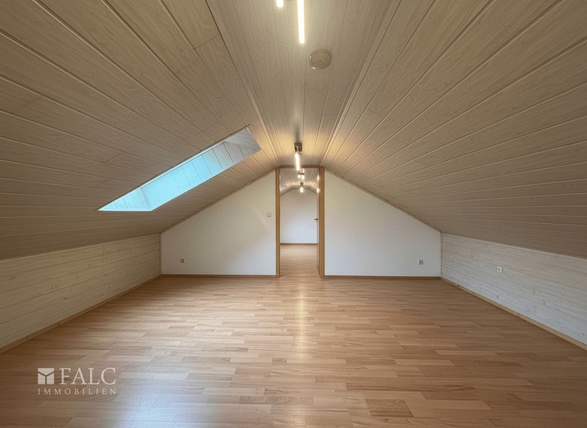 Über eine Treppe erreichen Sie das ausgebaute Dachgeschoss. Dieser Bereich eignet sich hervorragend als Rückzugsort, Studio oder für zwei weitere Schlafzimmer. Die Dachschrägen verleihen dem Raum eine gemütliche, wohnliche Atmosphäre.