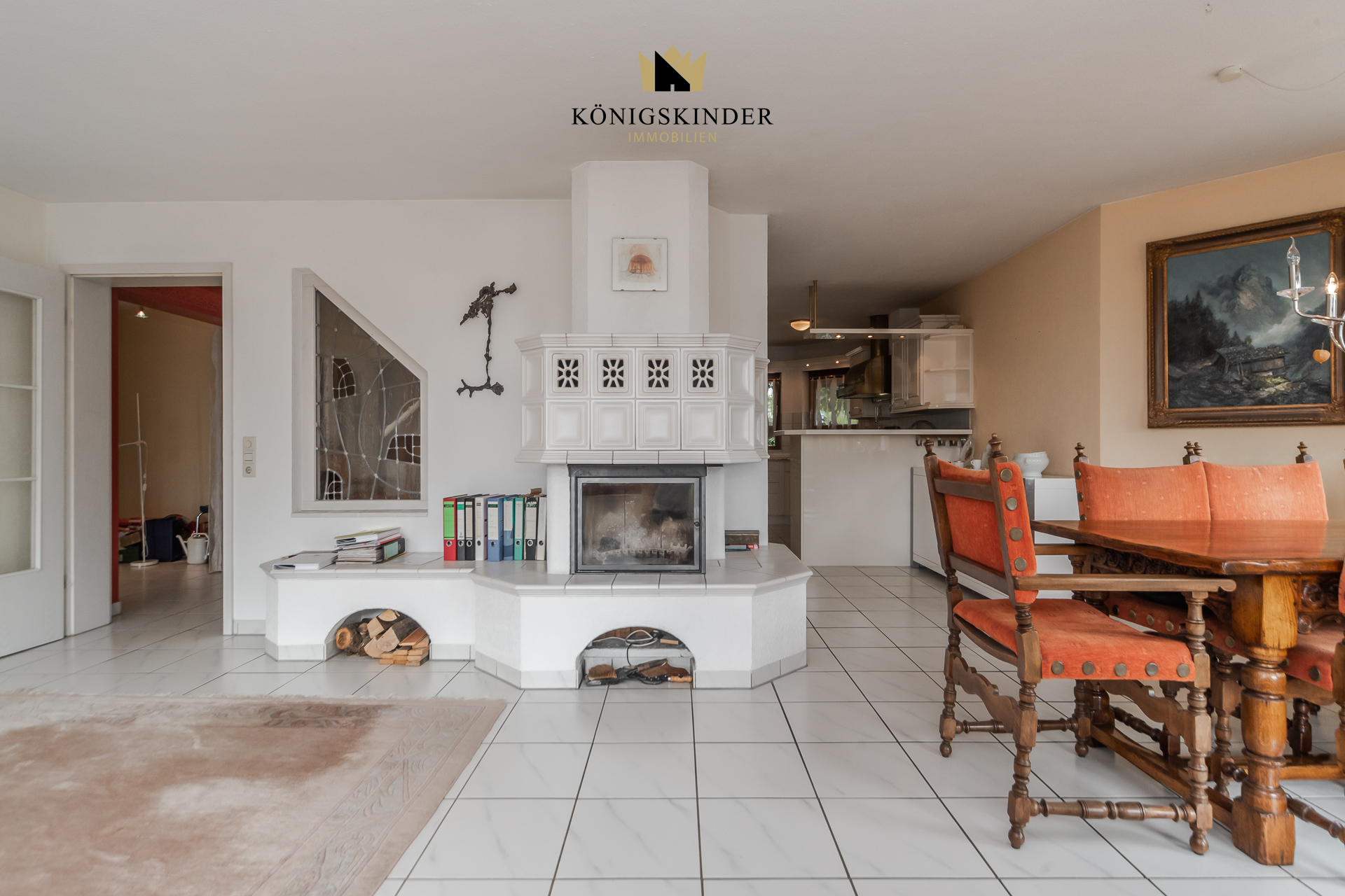 * Hauptwohnung: großzügiger, heller Wohn-/Essbereich mit Kamin & viel Glas; Terrasse mit Ausblick