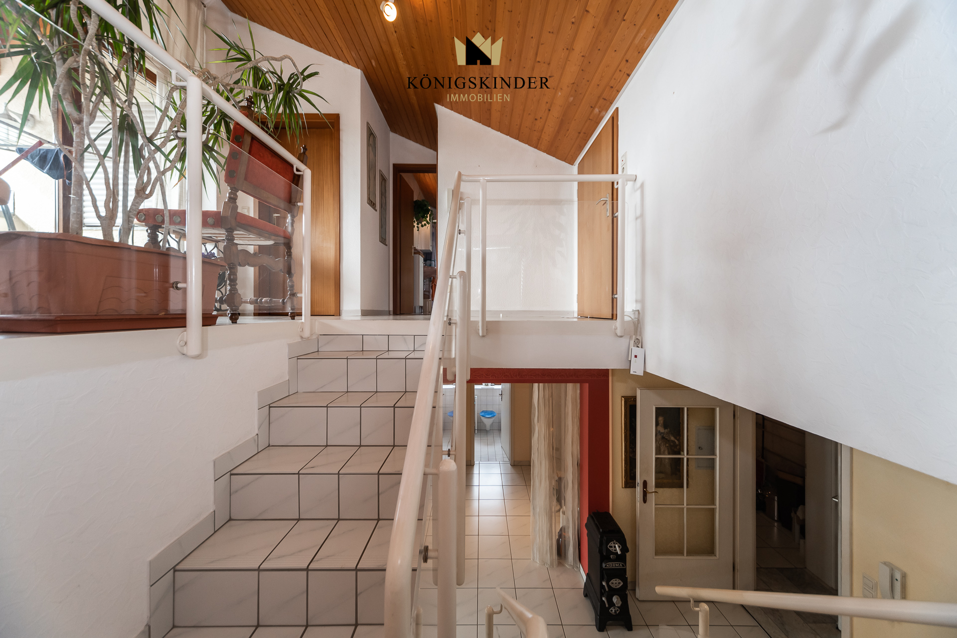 Das Herzstück ist die Hauptwohnung: ein großer Wohn-/Essbereich mit Kamin und großen Fensterflächen, die viel Licht hereinlassen und den Blick in den Garten öffnen. Von hier gelangen Sie direkt auf die Terrasse mit schönem Ausblick – ideal für entspannte Stunden im Freien. Auf dieser Ebene befinden sich außerdem ein Schlafzimmer, ein Bad, ein Gäste-WC sowie ein Abstellraum bzw. kleines Büro. Über die Treppe nach oben erreichen Sie zwei weitere helle Schlafzimmer, ein zusätzliches Bad und einen Balkon mit Aussicht.