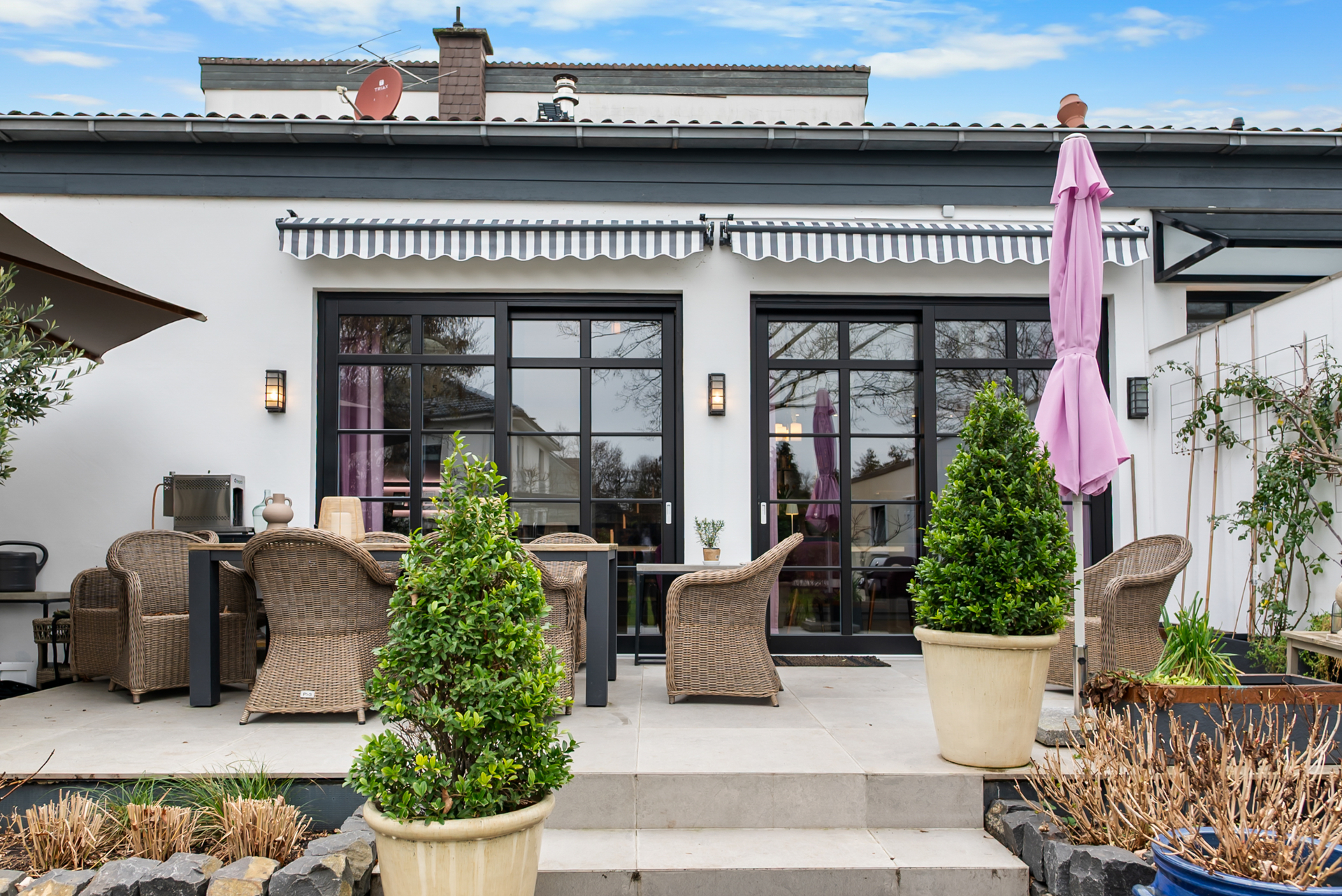 - Sofort bezugsfrei - ca. 650 m² Grundstück - ca. 440 m² großzügiger Garten - ca. 40 m² Süd-Ost-Terrasse mit optimaler Sonnenausrichtung - Offizielle Wohnfläche: ca. 165 m² - Doppelverglaste Fenster (Baujahr 2021) - Höchste technische Standards - Vollständig elektrifiziertes Smart-Home-Konzept (sprachgesteuert) - Neuer Brennwertofen - Fußbodenheizung im gesamten Haus - Hochwertiger Gaskamin - Automatische Komfort-WCs (Investition ca. 4.000–5.000 € pro Einheit) - Hochwertige Einbauküche mit High-End-Abzugshaube (ca. 5 Jahre alt, Neupreis ca. 50.000 €) - Zwei hochwertige Kühlschränke und Weinkühlschrank - Exklusive Elektrogeräte - Große Doppelgarage für 2 KFZ - Nahezu neuwertiger Gesamtzustand - Modernste Ausstattung in allen Bereichen - Hochwertige & luxuriöse Gesamtausstattung