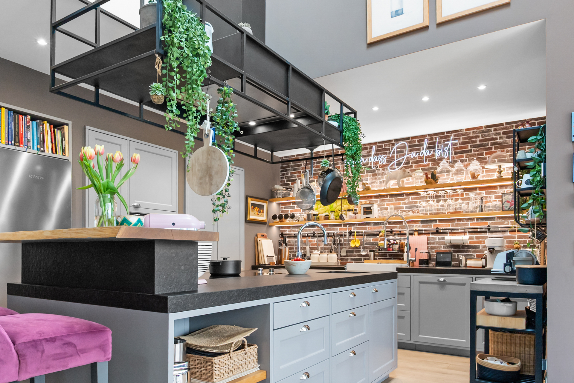Die exklusive Einbauküche mit einem ursprünglichen Investitionsvolumen von rund 50.000 € ist mit hochwertigen Elektrogeräten ausgestattet und verfügt über eine individuell designte High-End-Abzugshaube. Zwei hochwertige Kühlschränke sowie ein separater Weinkühlschrank runden das anspruchsvolle Küchendesign ab.