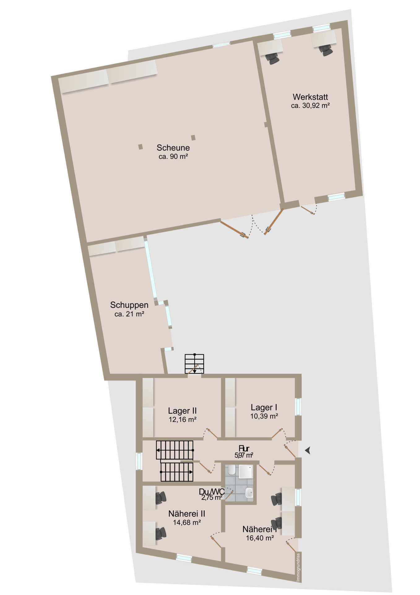 Außerhalb des Wohnhauses steht eine sehr große Scheune zur Verfügung, die vielseitig genutzt werden kann – etwa als Hobbyraum, Werkstatt, Lagerfläche oder für handwerkliche und kreative Projekte. Eine Garage sowie mehrere Stellplätze im geschützten Innenhof runden das Angebot ab und bieten komfortable Parkmöglichkeiten direkt am Haus.