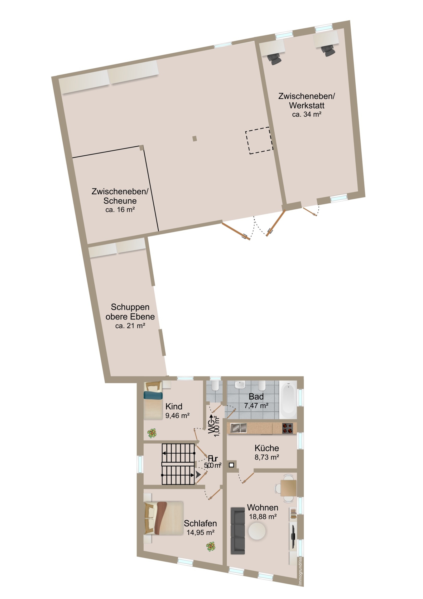Dieses Anwesen verbindet den Charme eines historischen Gebäudes mit praktischen Nutzungsmöglichkeiten für moderne Wohnbedürfnisse. Ob als großzügiges Familienhaus, Mehrgenerationenlösung oder Wohnen und Arbeiten unter einem Dach – hier sind viele Wohnkonzepte umsetzbar. Ein besonderes Objekt mit viel Potenzial, Platz und Charakter.