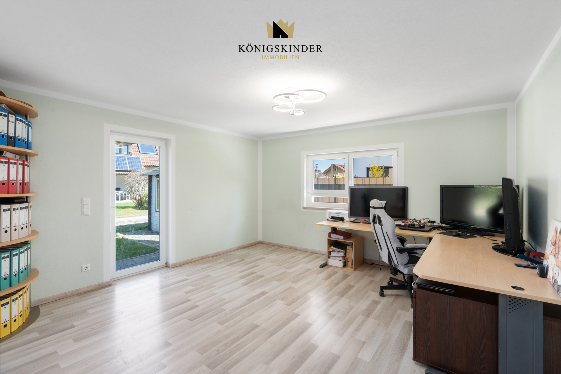 Im Erdgeschoss befindet sich der große Wohn/Essbereich mit Küche und Zugang zum Garten, Büro/Gast, Bad sowie die Garderobe mit Zugang zur Garage.