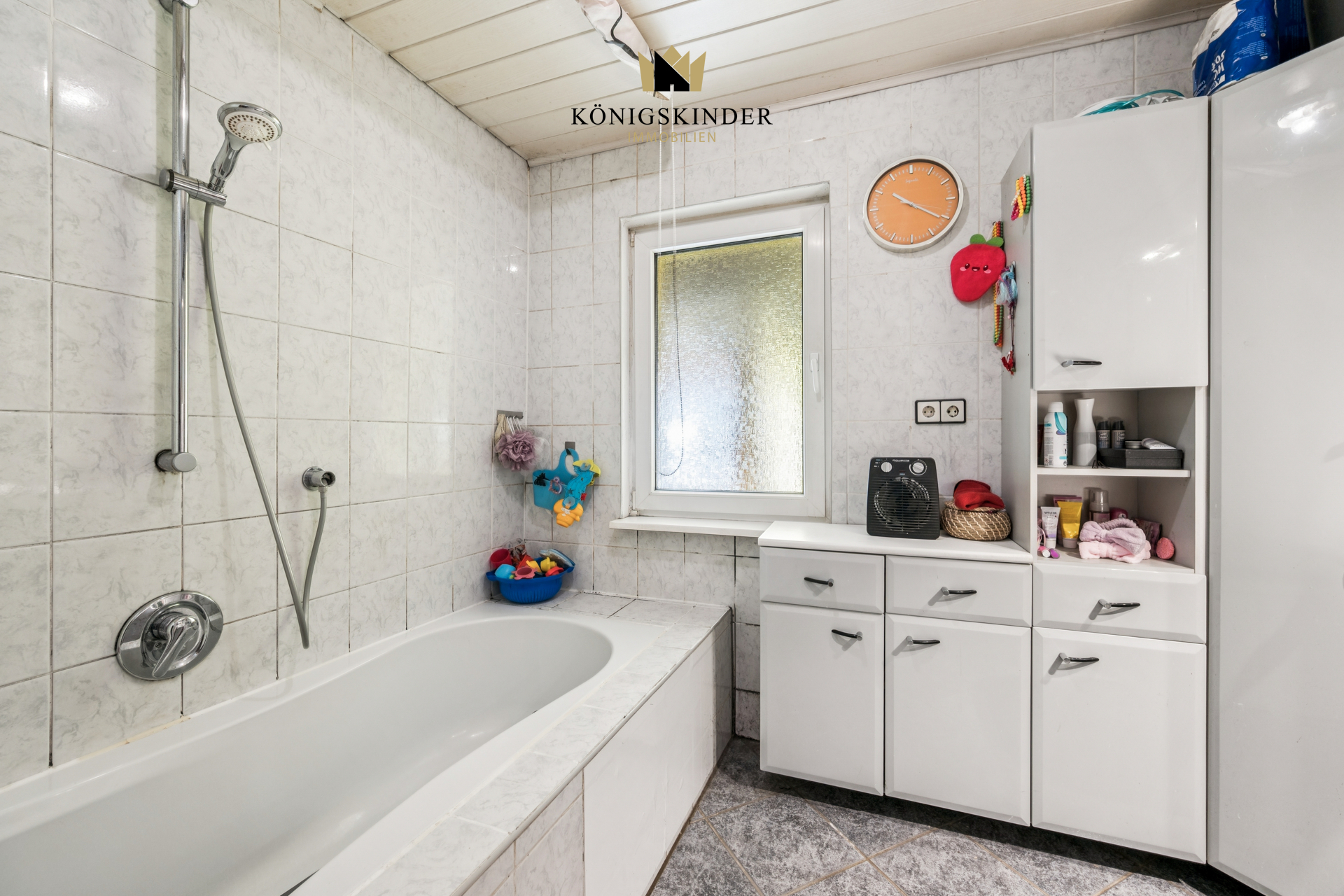 Für eine besonders behagliche Atmosphäre sorgt ein Kaminofen, der an kühleren Tagen wohlige Wärme spendet und dem Wohnbereich eine gemütliche, einladende Stimmung verleiht. Das Tageslichtbad ist mit einer Badewanne ausgestattet und bietet Raum für entspannte Momente.