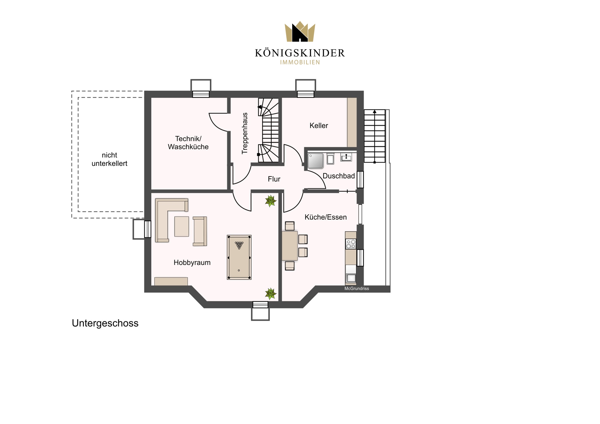 Das Untergeschoss bietet zusätzliches Entwicklungspotenzial: Der Ausbau für eine mögliche Einliegerwohnung wurde bereits vorbereitet. Eine Nutzungsänderung wurde bislang nicht beantragt und kann nicht garantiert werden. Bei erfolgreicher Genehmigung wäre eine Erweiterung der Wohnfläche auf ca. 250 m² mit insgesamt acht Wohnräumen denkbar.