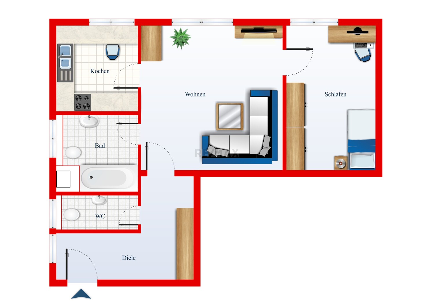 Bereits beim Betreten der Wohnung überzeugt der Wohnbereich, der eine gemütliche Wohnlandschaft und Essbereich bietet. Die Fenster sorgen für eine freundliche Atmosphäre. Das Schlafzimmer ist gut geschnitten und bietet Stellfläche für ein Bett und Schrank.