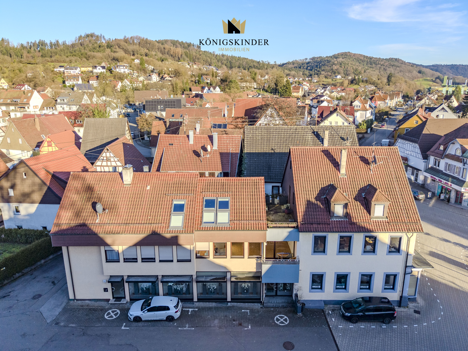 Der straßenseitige Vorderbau aus dem Jahr 1900 ist ein charmanter Blickfang im historischen Ortsbild. Repräsentative Gewerbeflächen im Erdgeschoss und ein etabliertes Atelier im Obergeschoss unterstreichen die Qualität der Lage. Die Dachgeschosswohnung mit Zugang zur Dachterrasse liegt ungestört und bietet Ausblicke auf den hübschen Ortskern.
