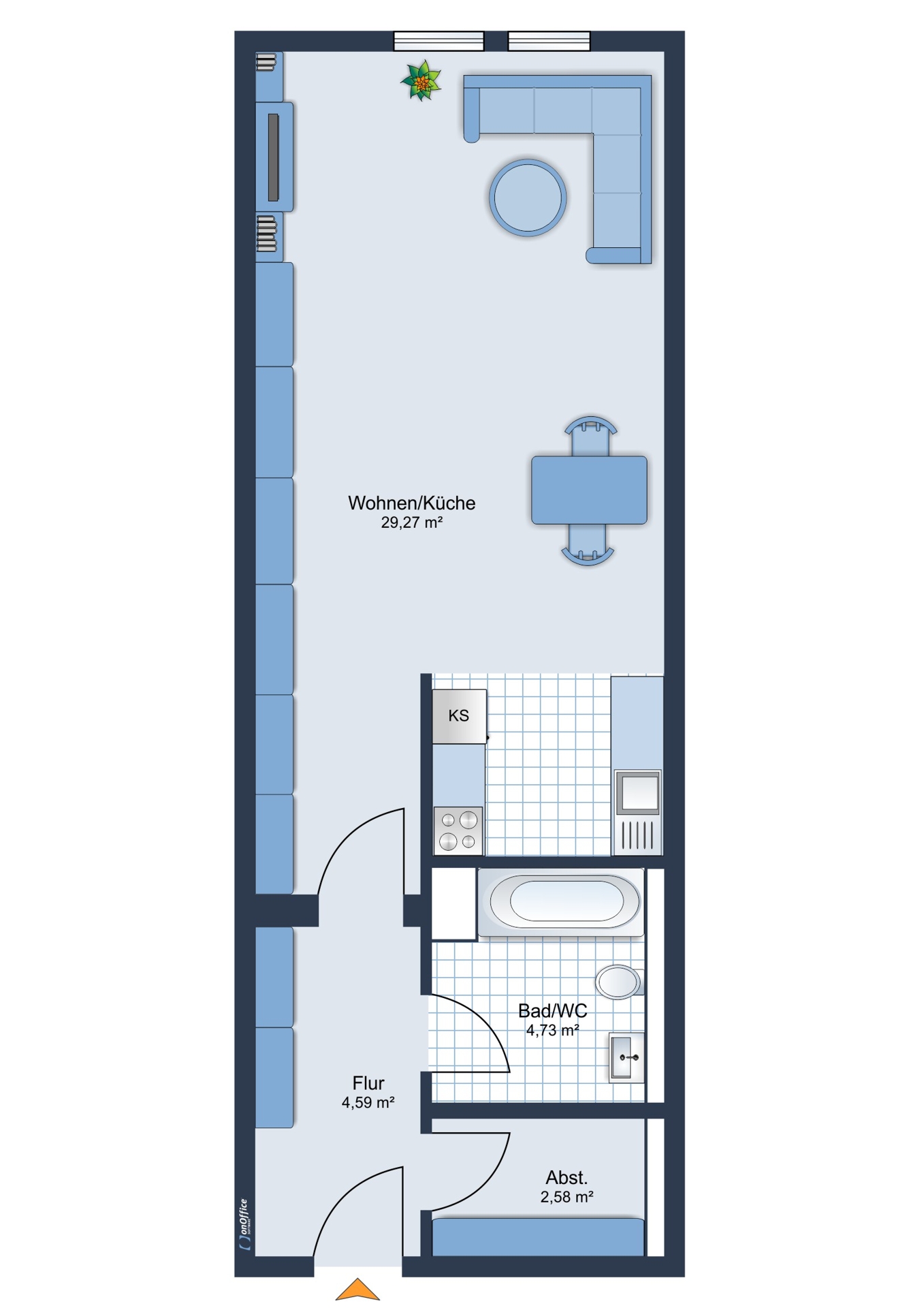 Das geräumige 1-Zimmer-Appartement liegt im ersten Stock eines gepflegten Mehrfamilienhauses mit 13 Einheiten. Aus dem abgeschlossenen Flur des Appartements gelangt man über jeweils eine Tür in den dazugehörigen Abstellraum, das Badezimmer mit Badewanne und das Wohn-/Esszimmer mit Küchennische. Es verfügt zudem über einen Waschraum mit eigenem Waschmaschinenanschluss sowie einen Tiefgaragenstellplatz – ein echter Pluspunkt in dieser städtischen Lage. Das Appartement ist bequem über einen Fahrstuhl zu erreichen.