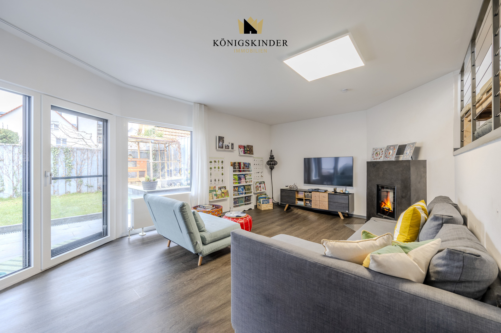 Ein besonderes architektonisches Highlight ist das gemütliche Kaminzimmer mit direktem Zugang zur Terrasse – ein wunderbarer Ort zum Abschalten und Genießen. Der Kaminofen sorgt nicht nur für wohlige Wärme und eine stimmungsvolle Atmosphäre, sondern dient zugleich als zusätzliche, alternative Energiequelle für das gesamte Haus.