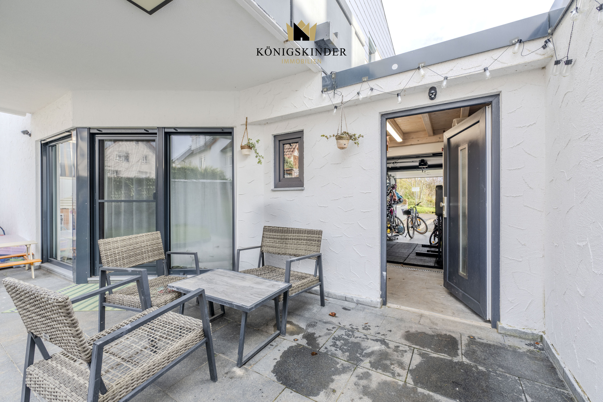 Abgerundet wird das Angebot durch eine großzügige Garage mit elektrischem Rolltor und direktem Zugang zum Garten – ein äußerst praktisches Detail für den Alltag, ob mit Einkäufen, Fahrrädern oder Gartengeräten.