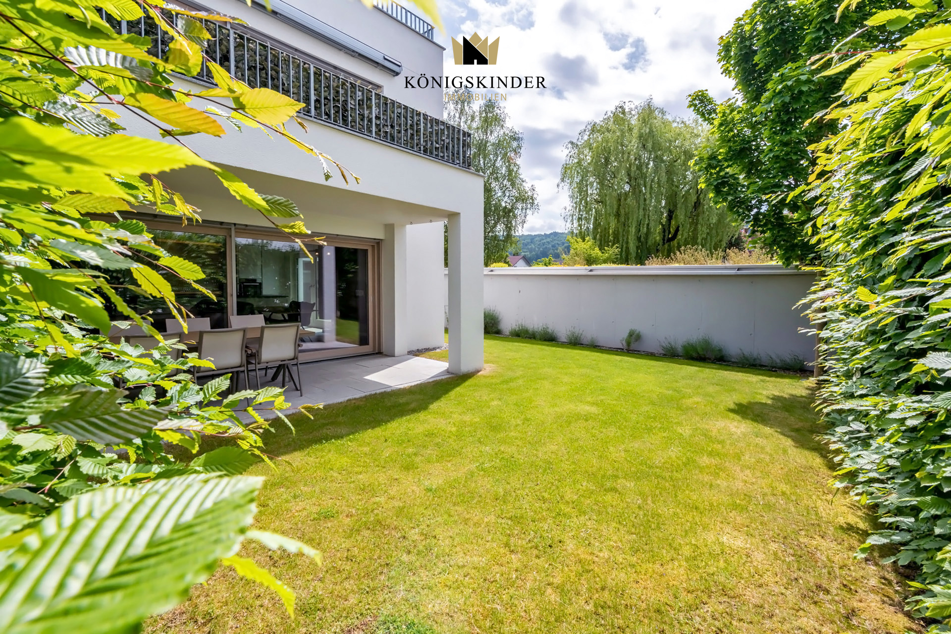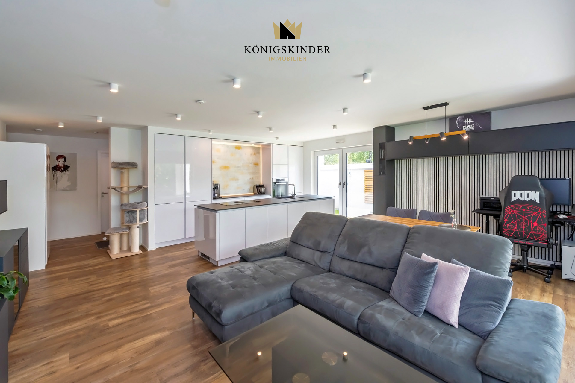 Alle Räume sind mit Bewegungsmeldern, Temperatur und Feuchtigkeitssensoren ausgestattet, sodass die Wohnung alle relevanten Parameter automatisch regeln kann. Der gut zu den weiß- verputzten Wänden passende Boden ist ein Vinylplankenboden in dunkler Echtholzoptik. Vom Wohn-/ Ess-/ und Küchenbereich aus betritt man den nach Südwesten ausgerichteten Garten und die große Terrasse, diese lädt zum Verweilen ein und bietet Platz für einen großen Tisch mit Stühlen. Bei einem Grillabend oder einfach nur zum Relaxen und Entspannen kann man hier die Ruhe genießen!