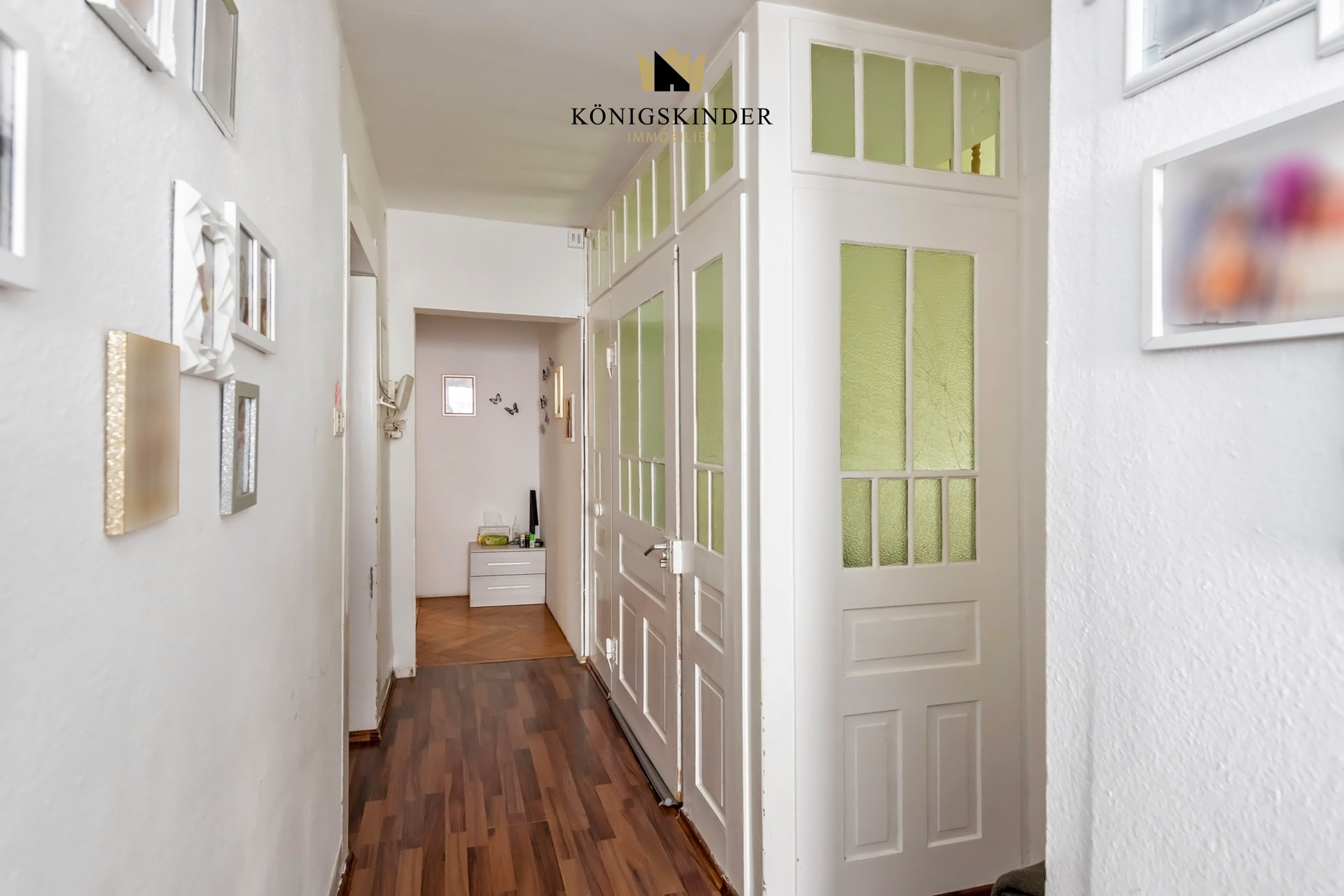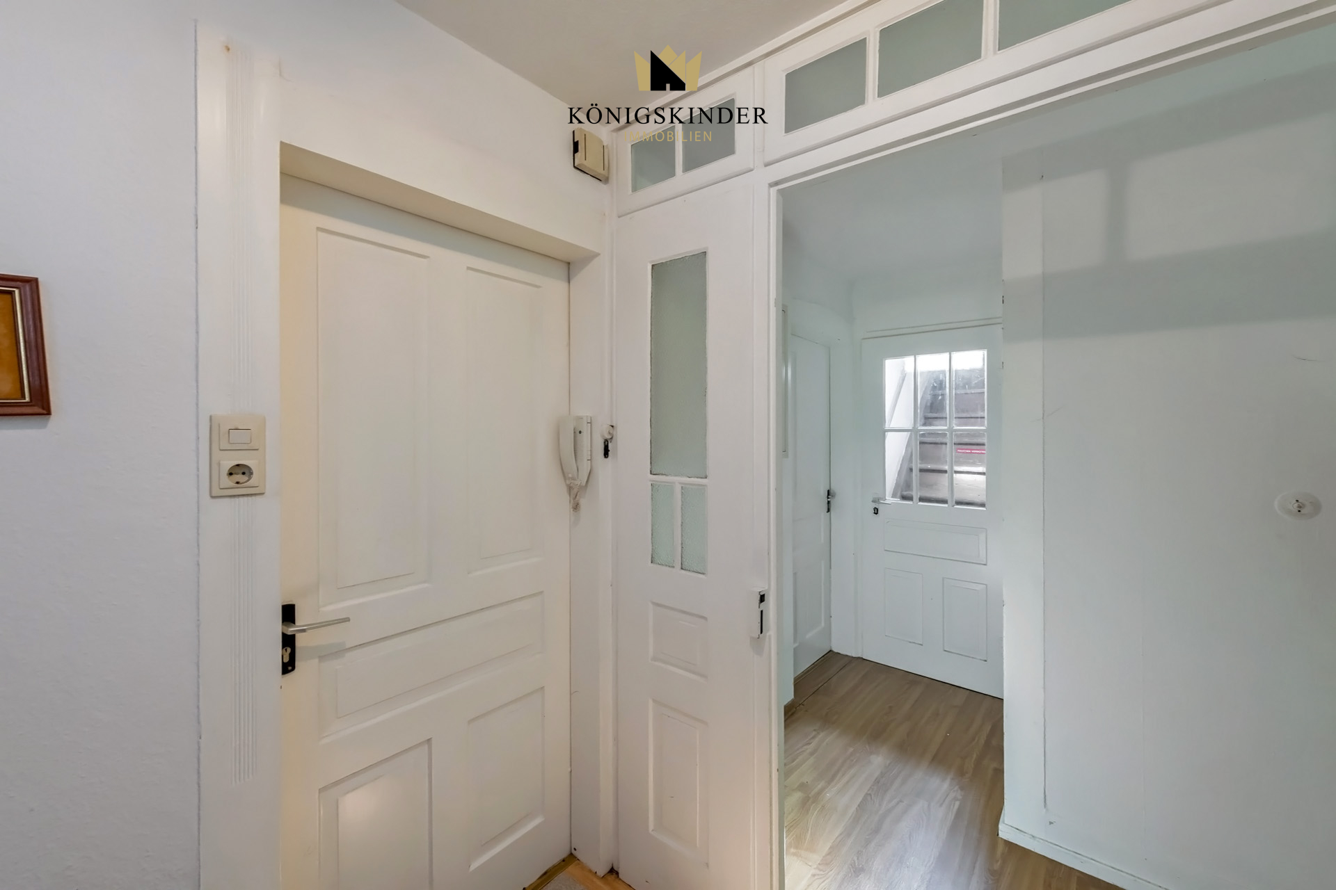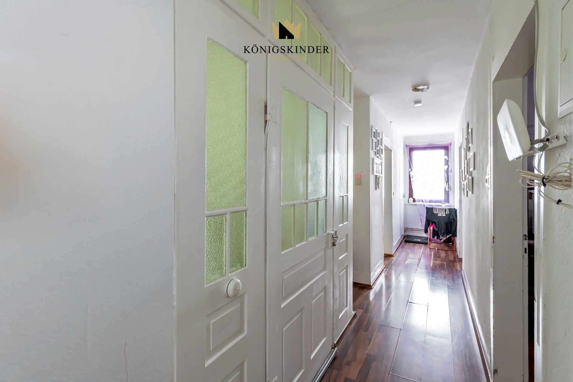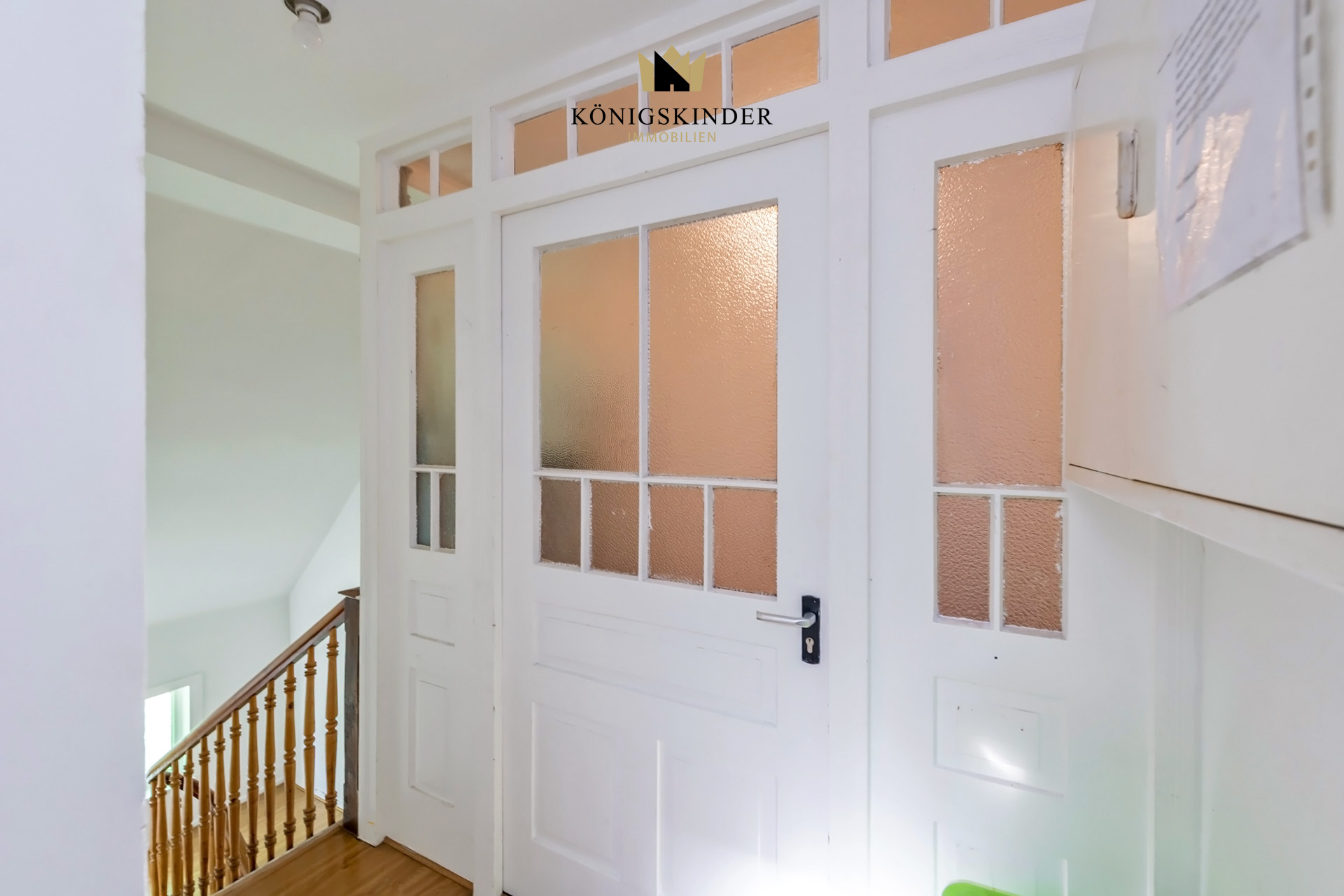 In den Wohnräumen des Erd- und Obergeschosses ist überwiegend hochwertiger Eichen-Fischgrät-Parkett in sehr gutem Zustand verlegt. Originale profilierte Holztüren mit Glasfüllungen zum Treppenhaus sowie Stuckverzierungen an den Decken verleihen dem Haus seinen besonderen historischen Charme.