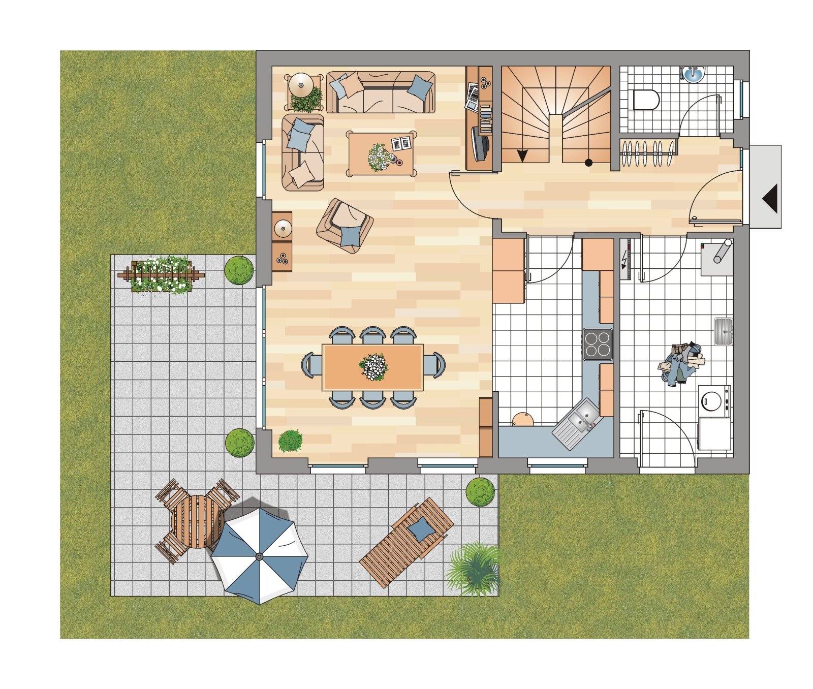 Der große Wohnbereich mit der offenen Küche schafft viel Platz für gesellige Stunden mit der Familie und Freunden. Die lichtdurchfluteten Räume schaffen einen schönen Blick in den Garten und Zugang zur vorgelagerten Terrasse. Ergänzt wird das Erdgeschoß durch ein Gäste-WC, einen praktischen Abstellraum, in dem Staubsauger und Bügelbrett ihren Platz finden sowie als Hauswirtschaftsraum für die Haustechnik. Ebenso lassen sich eine Wäscheleine und Schuhschrank unterbringen. Ein wahres Raumwunder.