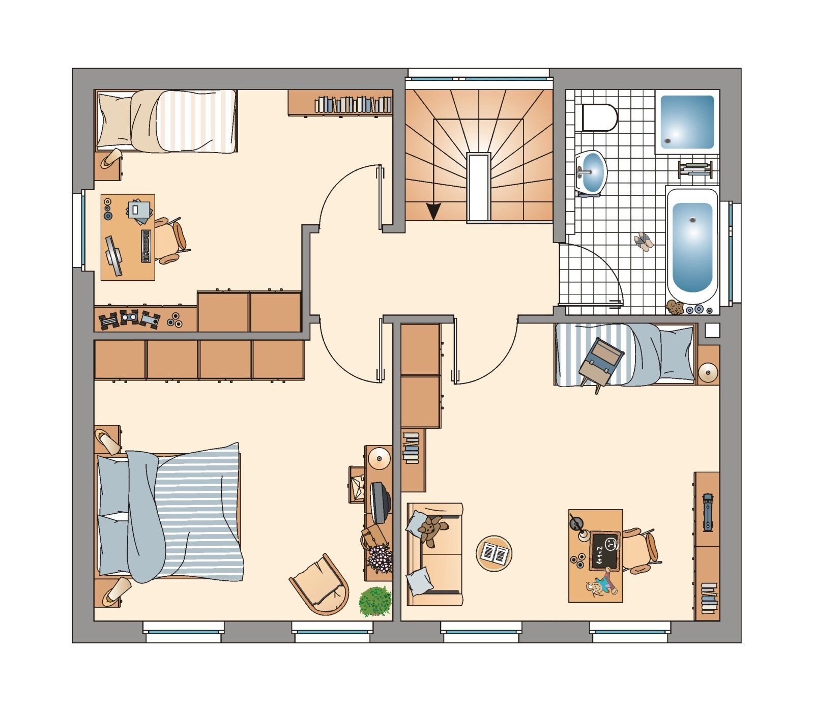 Über die elegante U-förmige Treppe in der Diele gelangen Sie in das Obergeschoß der Stadtvilla. Hier erwartet die Bewohner ihr persönlicher Rückzugsort um sich vom Alltag zu erholen. Das Schlafzimmer und ein Kinderzimmer dürfen sich dabei über den Blick in den eigenen Garten freuen. Ein weiteres Zimmer kann nach den individuellen Wünschen der Bewohner genutzt werden: entweder wird das dritte Zimmer ebenfalls als Kinderzimmer genutzt oder aber Sie haben die Möglichkeit diesen Raum als Home-Office zu nutzen. Auch als Gästezimmer lässt sich dieser Raum sicher hin und wieder nutzen. Das Familienbadezimmer mit Dusche und Badewanne runden dieses durchdachte Wohnkonzept ab.