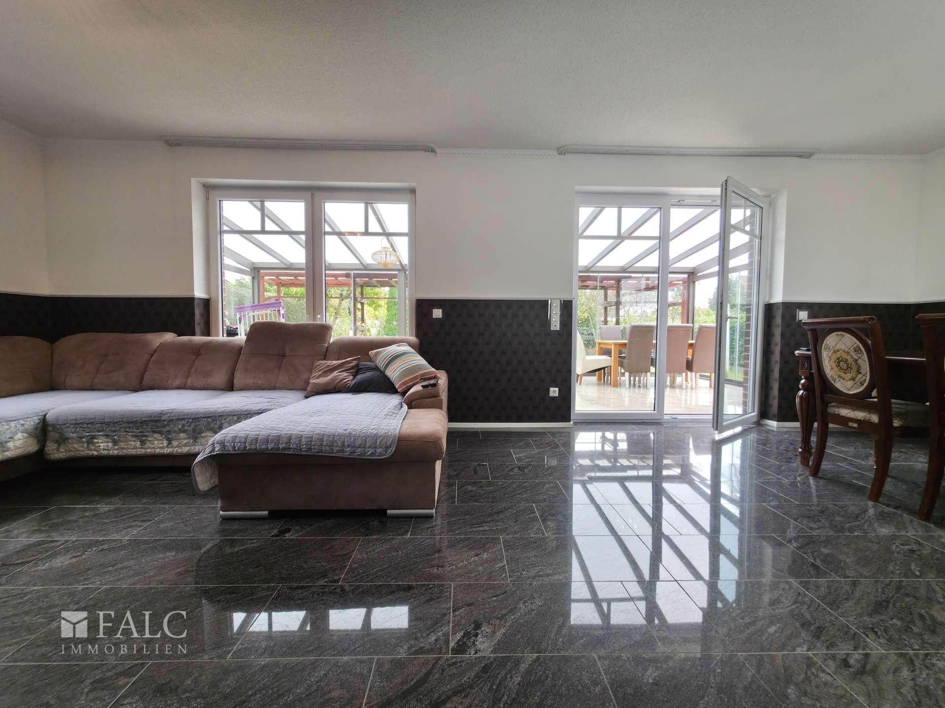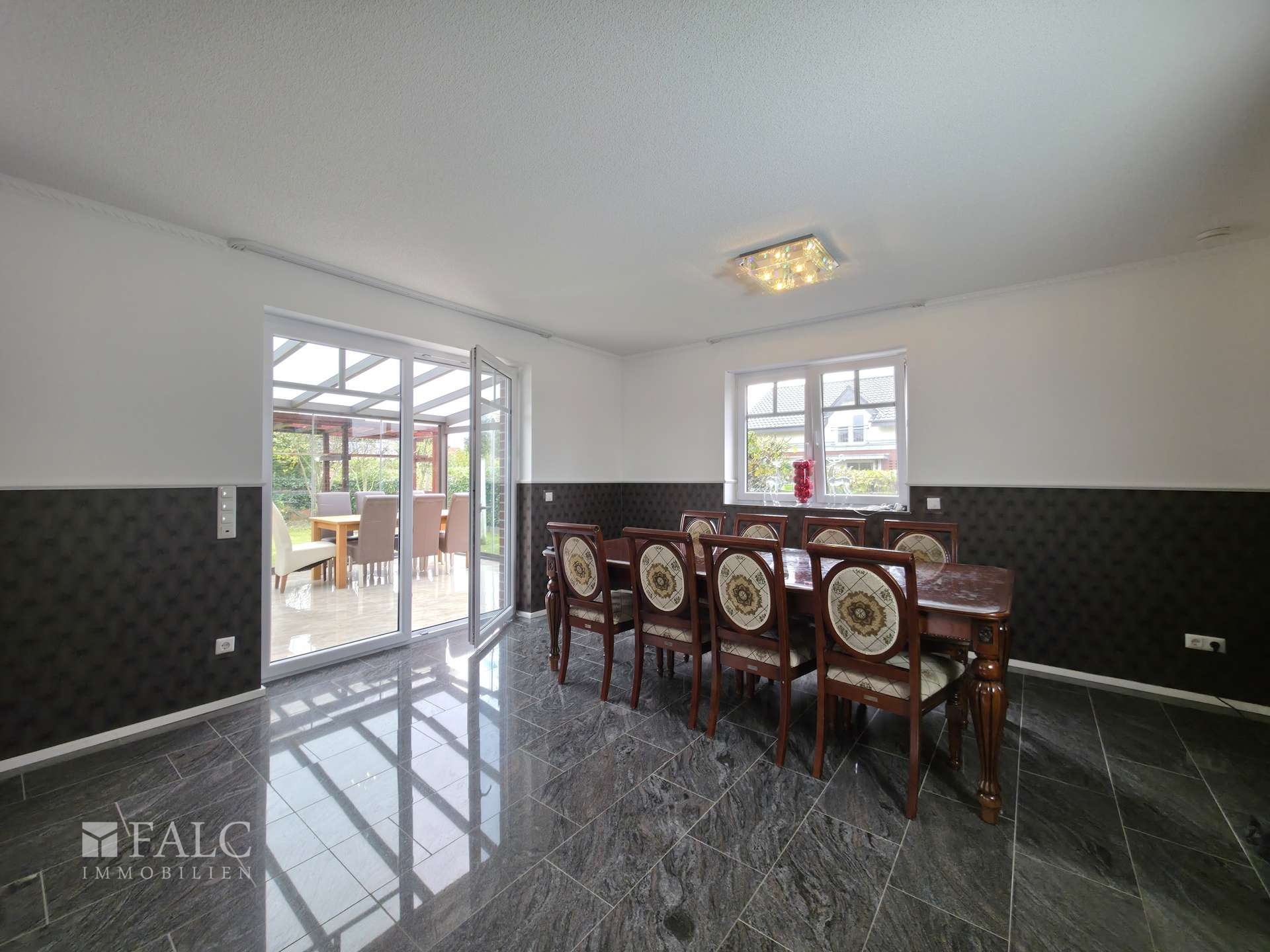 Das Erdgeschoss empfängt Sie mit einer zentralen Diele, von der aus alle wichtigen Bereiche erreichbar sind. Der großzügige Wohn- und Essbereich bildet das Herzstück des Hauses. Große Fensterflächen sorgen für viel Tageslicht und ermöglichen einen weiten Blick in den Garten. Der anschließende Wintergarten erweitert den Wohnraum und eignet sich perfekt als Ruhezone, Essbereich oder zusätzlicher Aufenthaltsraum – unabhängig von der Jahreszeit.
