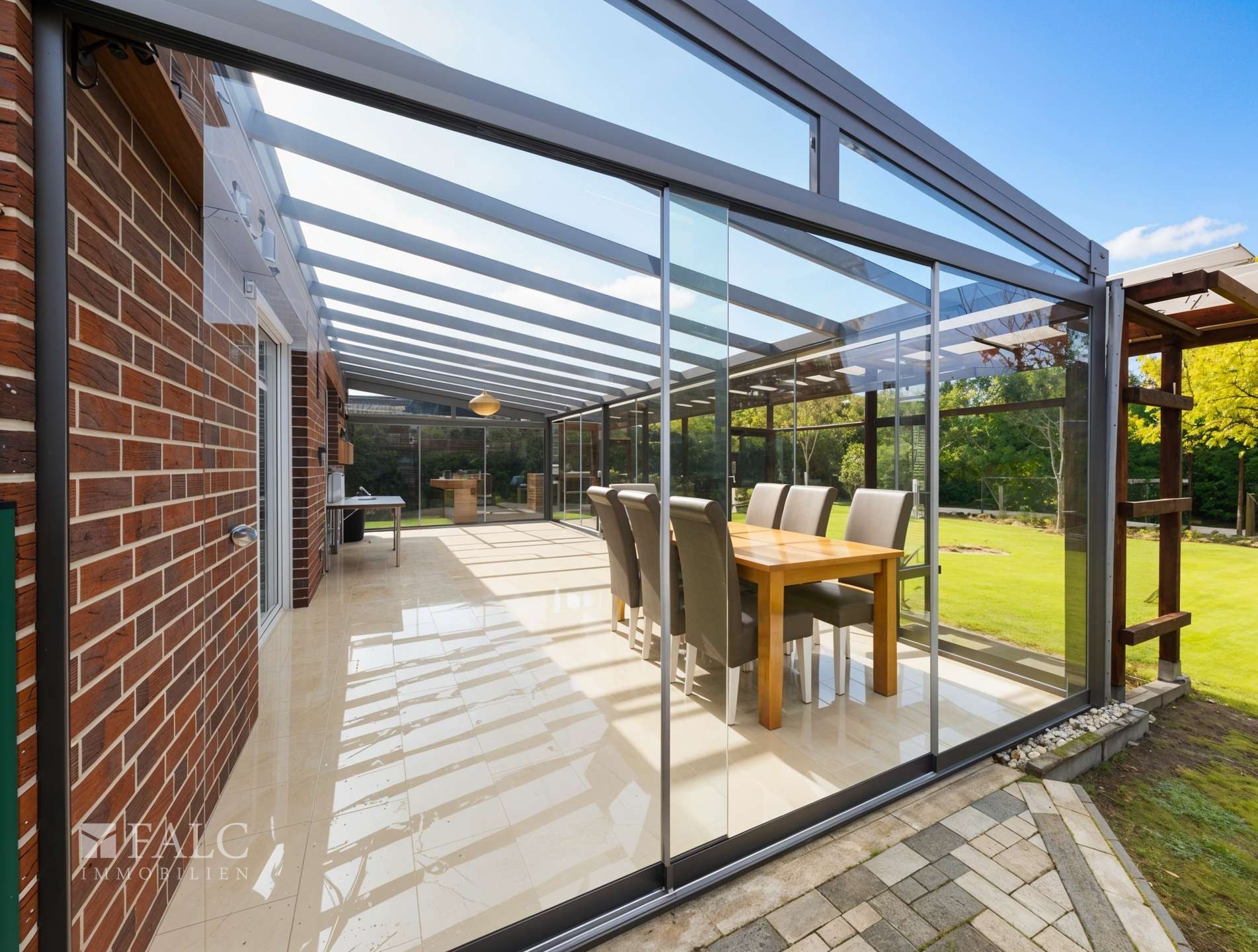 Die Immobilie steht auf einem 600 m² großen Grundstück, das vielfältige Nutzungsmöglichkeiten bietet. Hinter dem Wintergarten erstreckt sich ein großer, pflegeleichter Garten, der viel Privatsphäre bietet und sowohl für Familienaktivitäten als auch für entspannte Stunden im Grünen ideal ist.