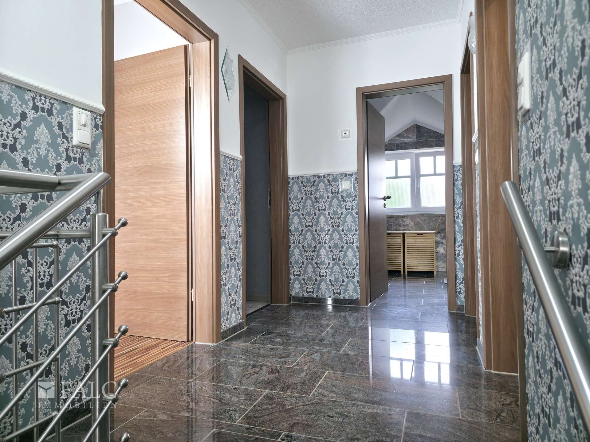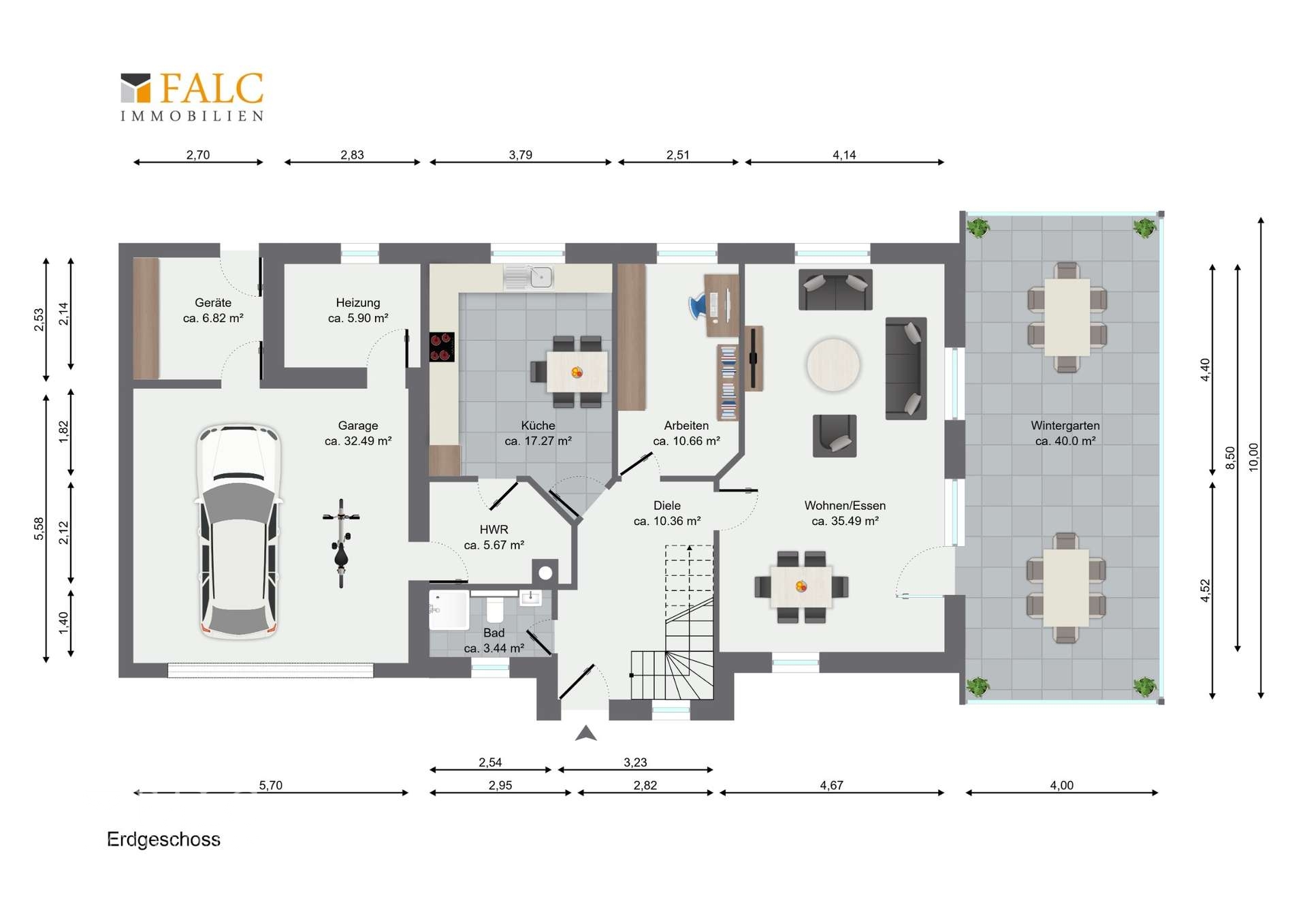 Erdgeschoss • Großzügiger, heller Wohn- und Essbereich mit großen Fensterflächen • Zugang zu einem großzügigen, ganzjährig nutzbaren Wintergarten ( 40m²) • Küche mit direkter Anbindung an den Hauswirtschaftsraum • Praktischer Hauswirtschaftsraum zwischen Küche und Doppelgarage (interner Zugang) • Separates Zimmer nutzbar als Büro, Gästezimmer oder Hobbyraum • Gäste-/Duschbad mit hochwertigen Granitelementen • Weitere Nutzräume wie Gerätebereich und Technik-/Heizungsraum