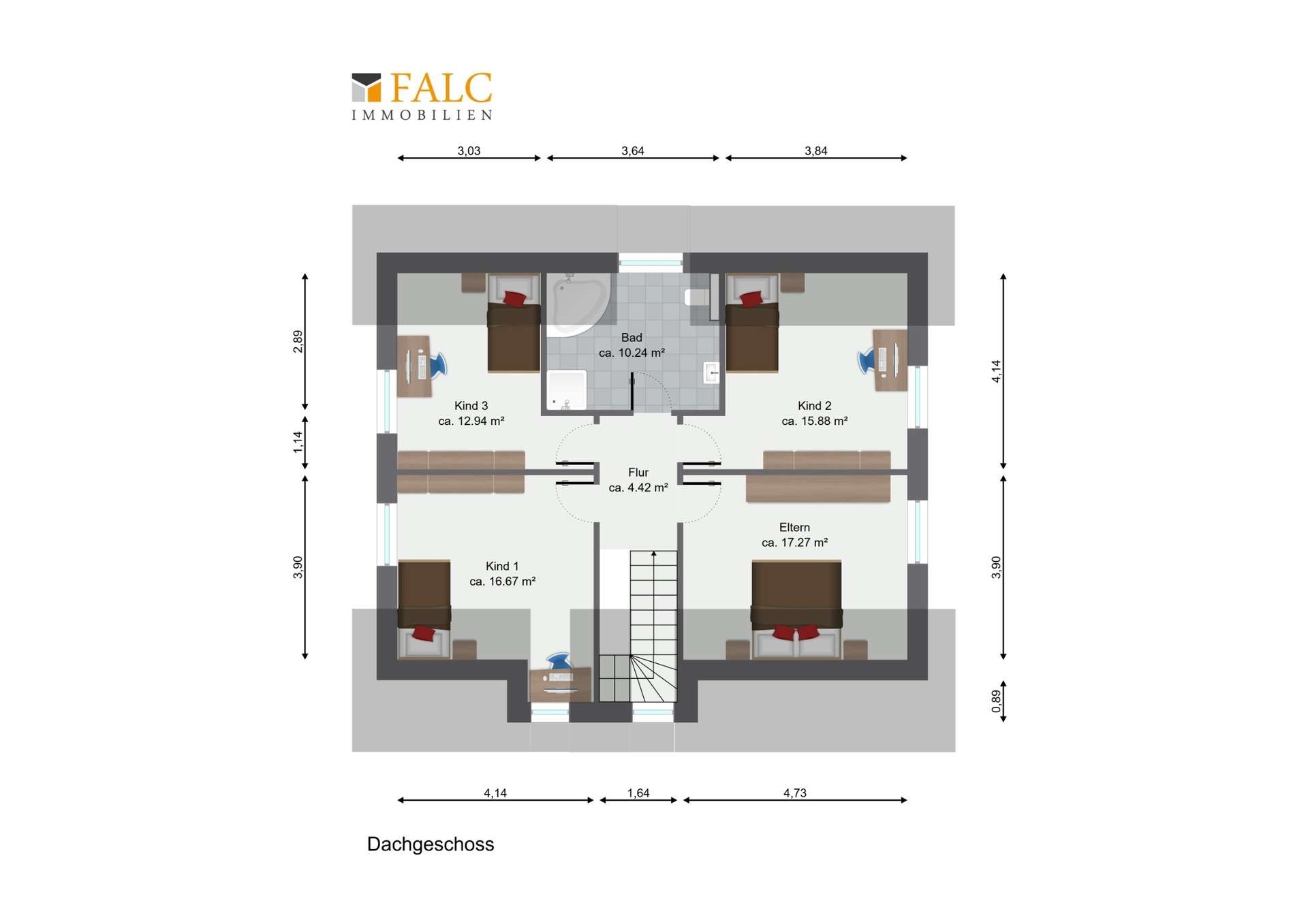 Im Dachgeschoss stehen insgesamt vier Schlafzimmer zur Verfügung, die flexibel als Kinder-, Arbeits- oder Gästezimmer genutzt werden können – ideal für größere Familien oder Menschen mit Home-Office-Bedarf. Ein geräumiges Familienbad mit Eckbadewanne und Dusche bietet hohen Komfort. Das Elternschlafzimmer liegt ruhig zur Gartenseite und bietet viel Stellfläche.