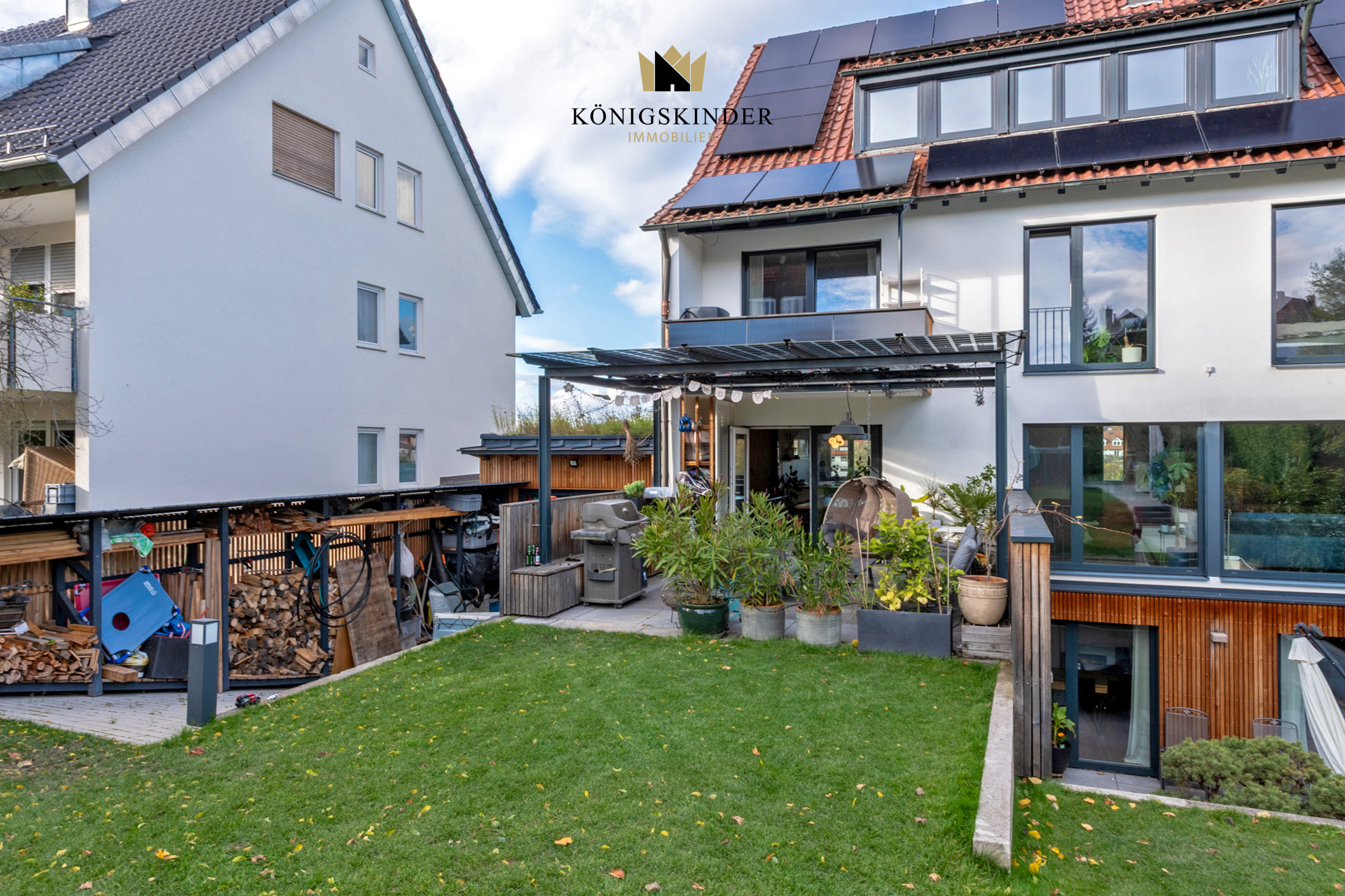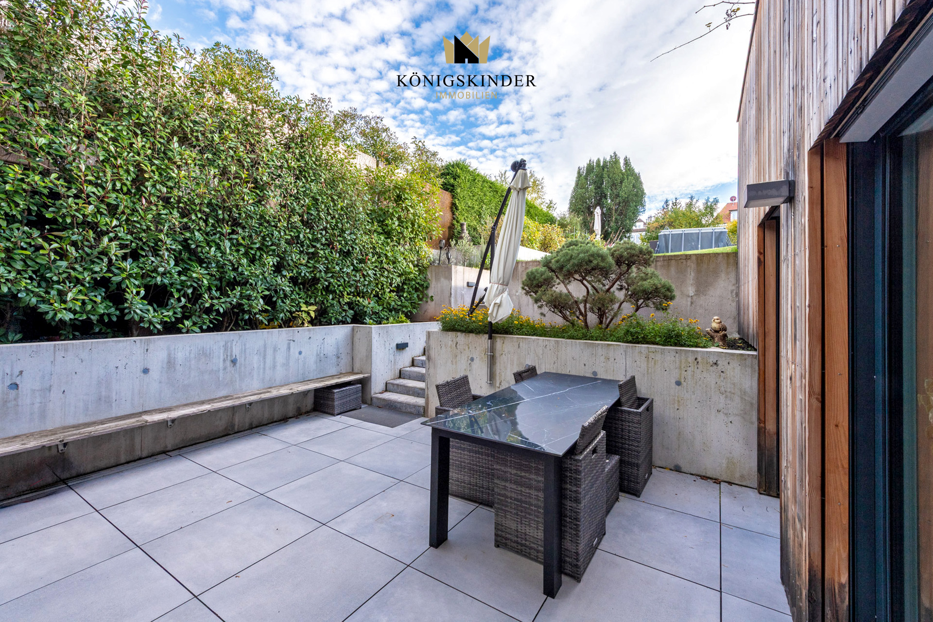 Auf 330 m² entfaltet sich Wohnkomfort in drei Ebenen. Das Untergeschoss bietet flexible Nutzungsmöglichkeiten als Einliegerwohnung oder Büro, während die Maisonette-Hauptwohnung im Erd- und Obergeschoss mit Terrasse und Pergola den perfekten Ort für gesellige Abende oder entspannte Sonntage schafft. Im Dachgeschoss laden helle, gemütliche Räume zum Rückzug ein – hier genießen Sie Ruhe und Weitblick über das Naturschutzgebiet.