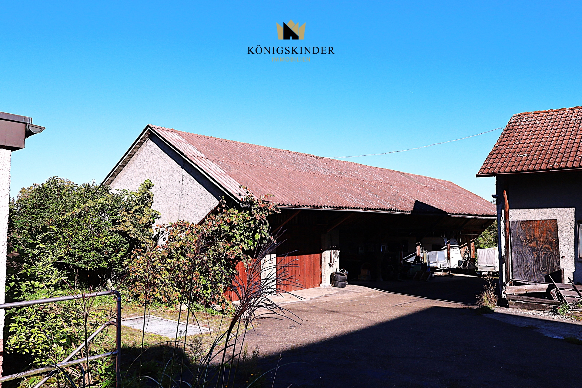 - eine ehemalige Scheune mit offener Halle für Fahrzeuge und zwei Garagen - ein ehemaliger Stall für Viehwirtschaft (beide Gebäude können auch entfernt werden)