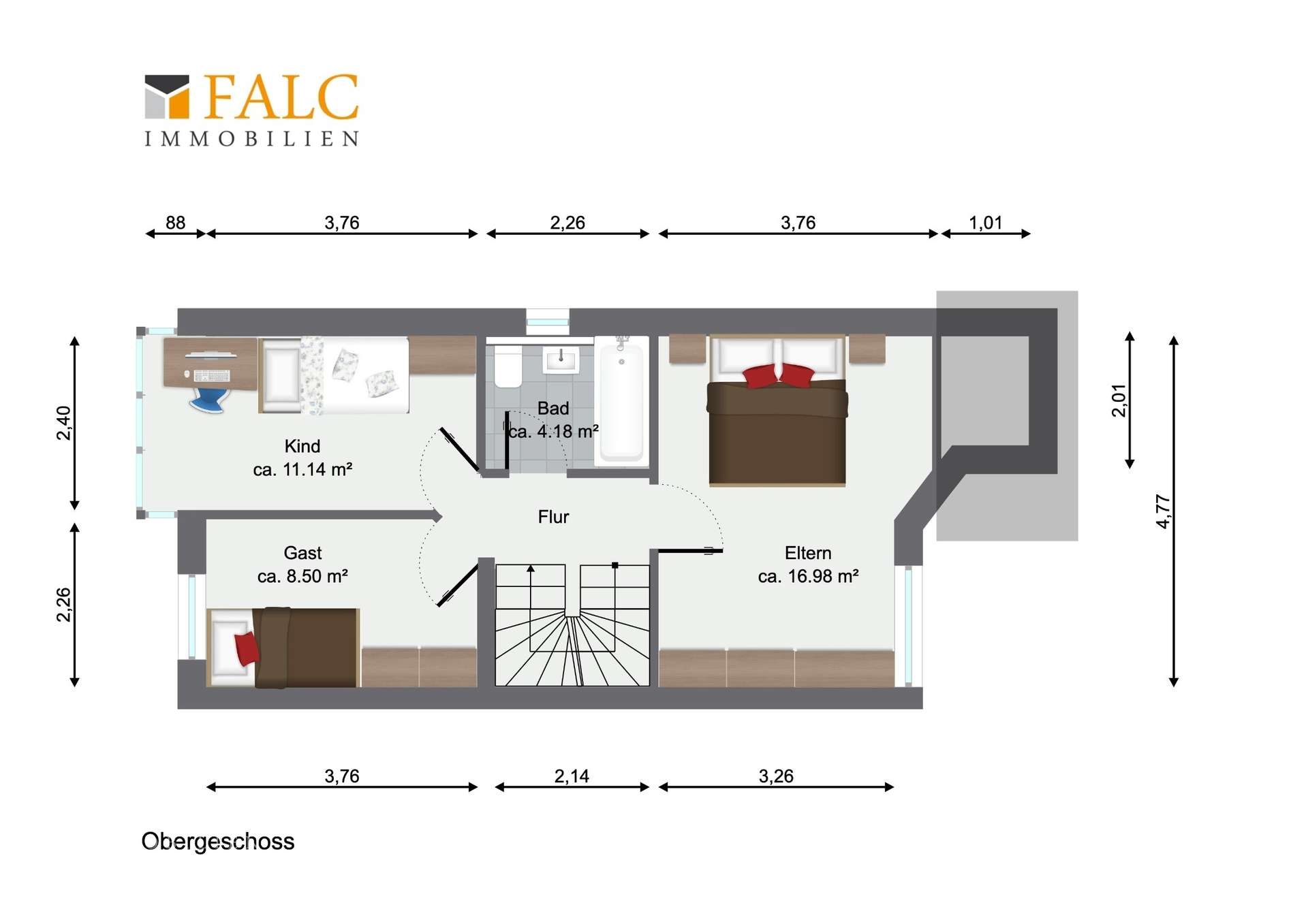 Insgesamt stünden ,inkl. des Spitzbodens, fünf Zimmer zur Verfügung, darunter drei Schlafzimmer, ein Wohnzimmer sowie optional ein Homeoffice im Spitzboden. Ein Badezimmer im Obergeschoss sowie ein Gäste-WC im Erdgeschoss ergänzen die Grundausstattung.