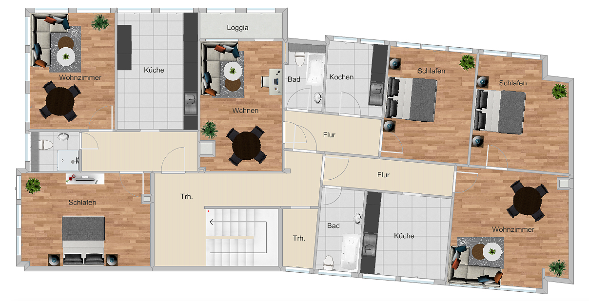 Das Gebäude umfasst insgesamt fünf Wohneinheiten und zwei Gewerbeeinheiten.